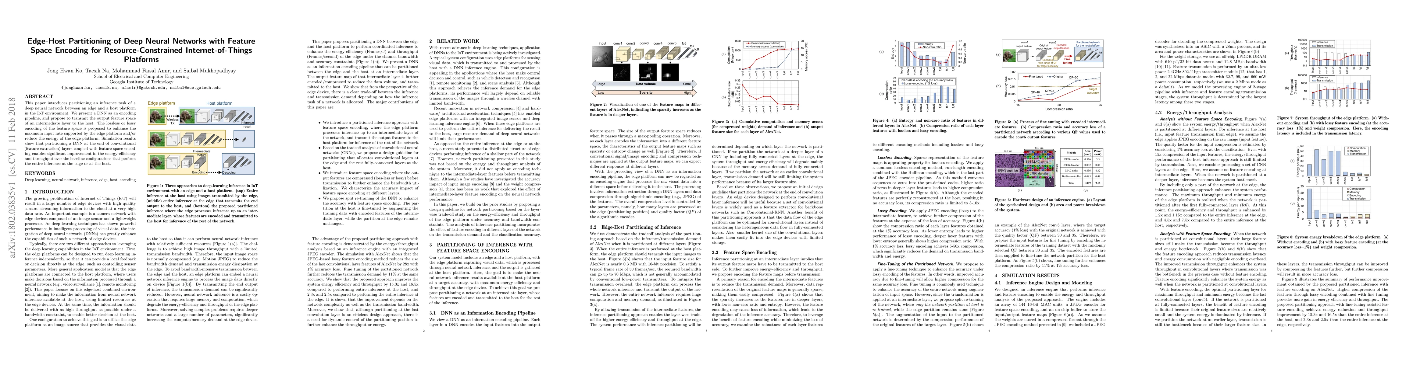 This paper proposes a method to improve energy efficiency and throughput for IoT platforms by partitioning deep neural networks and encoding their feature spaces. Simulation results show significant improvements over baseline configurations.