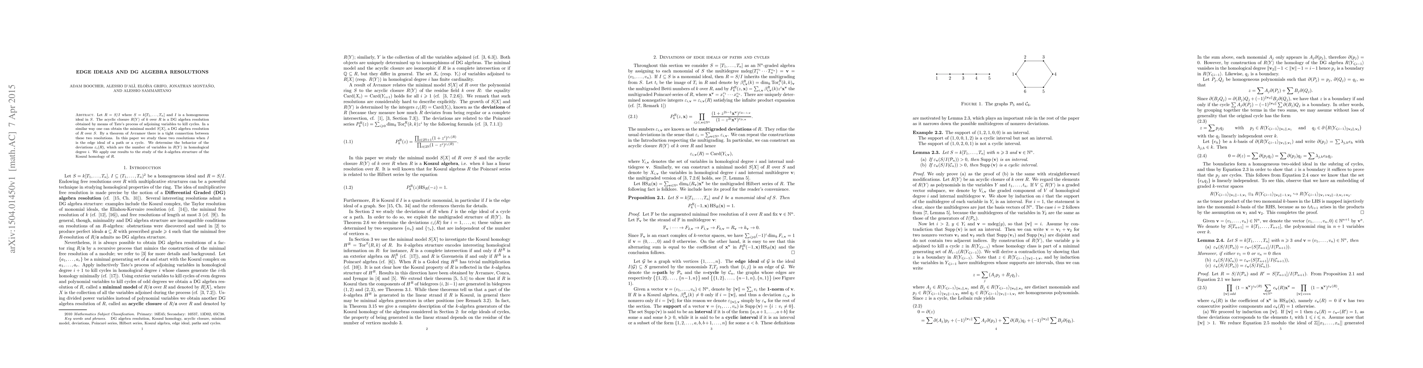 This paper examines DG algebra resolutions, specifically the acyclic closure and minimal model, for quotient rings $R=S/I$ where $I$ is the edge ideal of a path or cycle. It determines the behavior of deviations $\varepsilon_i(R)$ in homological degree $i$ and applies these findings to the $k$-algebra structure of Koszul homology of $R$.