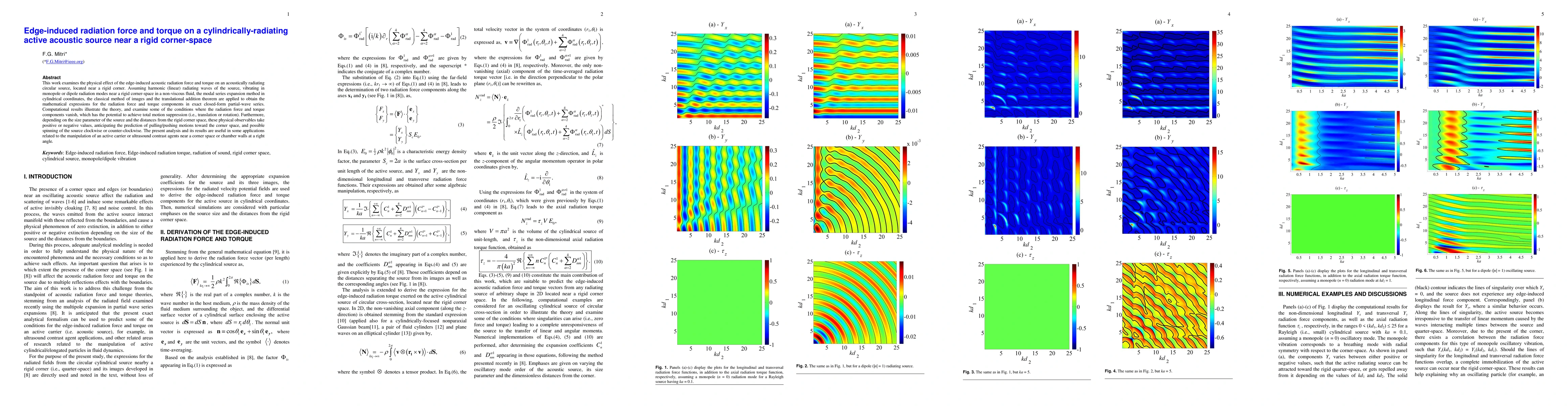 This paper investigates the edge-induced acoustic radiation force and torque on a cylindrically-radiating active acoustic source near a rigid corner, deriving exact closed-form expressions using modal series expansion and the method of images. The results reveal conditions under which the force and torque vanish, potentially enabling total motion suppression, and predict pulling/pushing motions and spinning effects based on source and distance parameters.