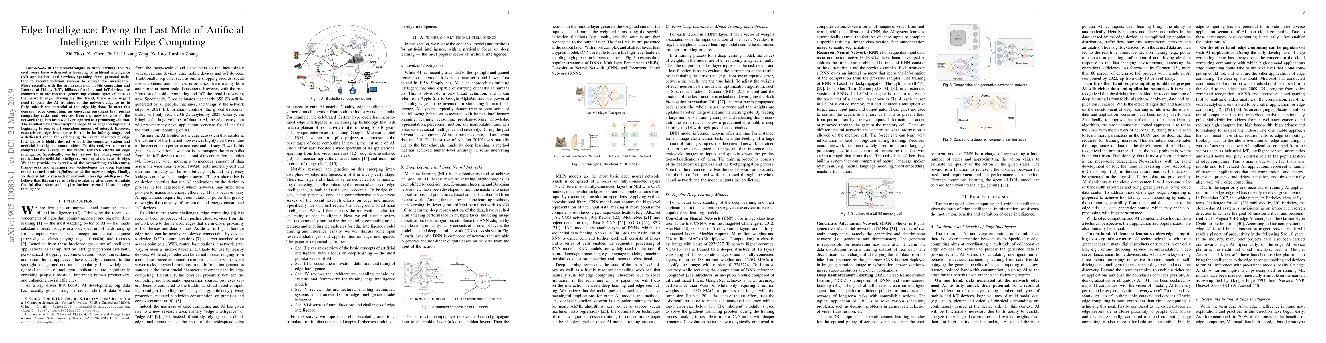 With the breakthroughs in deep learning, the recent years have witnessed a booming of artificial intelligence (AI) applications and services, spanning from personal assistant to recommendation systems to video/audio surveillance. More recently, with the proliferation of mobile computing and Internet-of-Things (IoT), billions of mobile and IoT devices are connected to the Internet, generating zillions Bytes of data at the network edge. Driving by this trend, there is an urgent need to push the AI frontiers to the network edge so as to fully unleash the potential of the edge big data. To meet this demand, edge computing, an emerging paradigm that pushes computing tasks and services from the network core to the network edge, has been widely recognized as a promising solution. The resulted new inter-discipline, edge AI or edge intelligence, is beginning to receive a tremendous amount of interest. However, research on edge intelligence is still in its infancy stage, and a dedicated venue for exchanging the recent advances of edge intelligence is highly desired by both the computer system and artificial intelligence communities. To this end, we conduct a comprehensive survey of the recent research efforts on edge intelligence. Specifically, we first review the background and motivation for artificial intelligence running at the network edge. We then provide an overview of the overarching architectures, frameworks and emerging key technologies for deep learning model towards training/inference at the network edge. Finally, we discuss future research opportunities on edge intelligence. We believe that this survey will elicit escalating attentions, stimulate fruitful discussions and inspire further research ideas on edge intelligence.