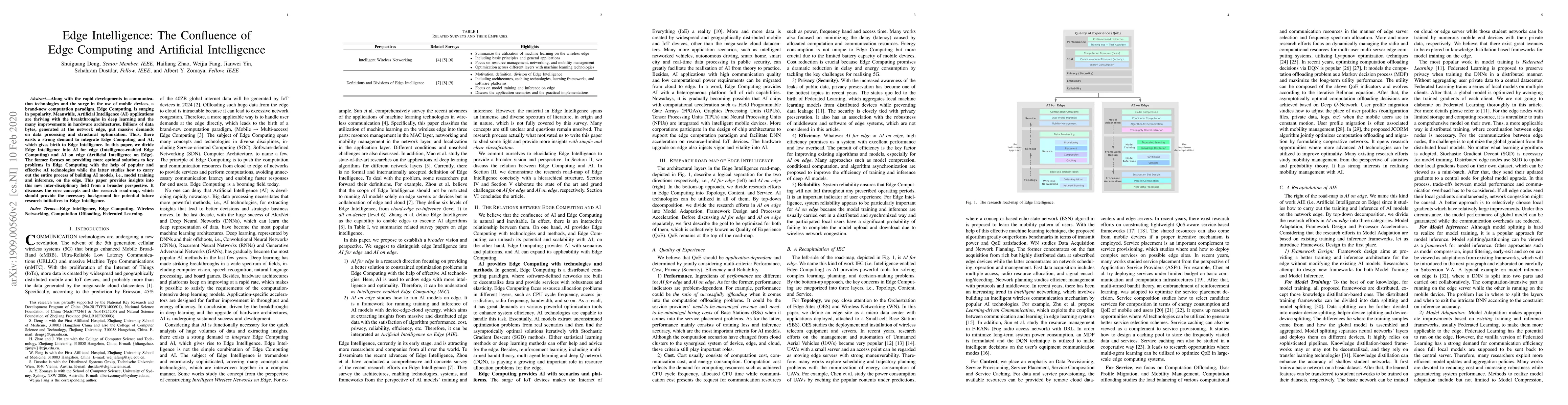 Along with the rapid developments in communication technologies and the surge in the use of mobile devices, a brand-new computation paradigm, Edge Computing, is surging in popularity. Meanwhile, Artificial Intelligence (AI) applications are thriving with the breakthroughs in deep learning and the many improvements in hardware architectures. Billions of data bytes, generated at the network edge, put massive demands on data processing and structural optimization. Thus, there exists a strong demand to integrate Edge Computing and AI, which gives birth to Edge Intelligence. In this paper, we divide Edge Intelligence into AI for edge (Intelligence-enabled Edge Computing) and AI on edge (Artificial Intelligence on Edge). The former focuses on providing more optimal solutions to key problems in Edge Computing with the help of popular and effective AI technologies while the latter studies how to carry out the entire process of building AI models, i.e., model training and inference, on the edge. This paper provides insights into this new inter-disciplinary field from a broader perspective. It discusses the core concepts and the research road-map, which should provide the necessary background for potential future research initiatives in Edge Intelligence.