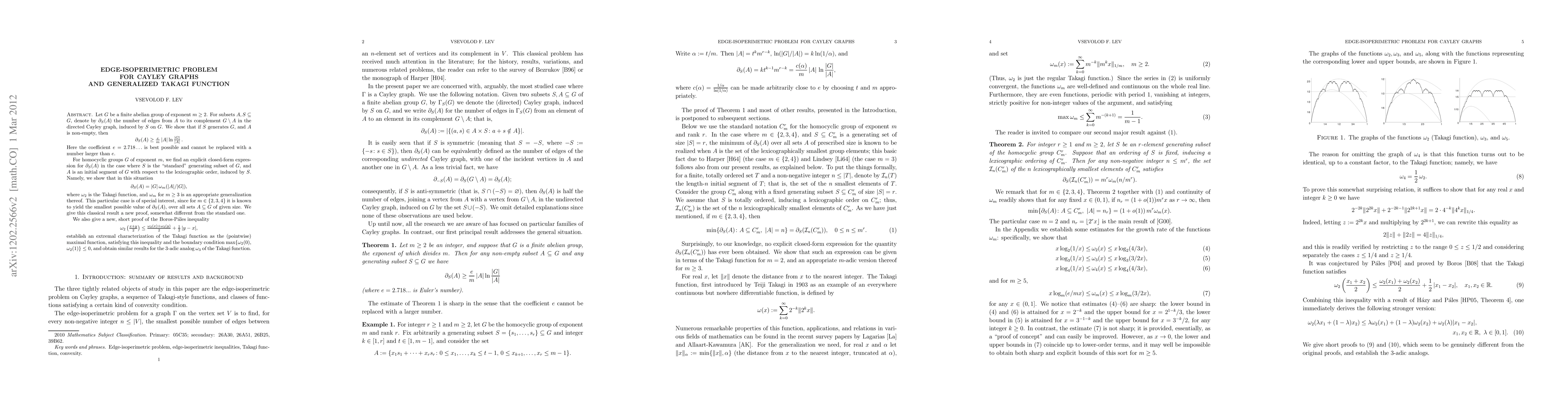 Let $G$ be a finite abelian abelian group of exponent $m\ge 2$. For subsets $A,S\subset G$, denote by $\partial_S(A)$ the number of edges from $A$ to its complement $G\setminus A$ in the directed Cayley graph, induced by $S$ on $G$. We show that if $S$ generates $G$, and $A$ is non-empty, then $$ \partial_S(A) \ge \frac{e}m\,|A|\ln\frac{|G|}{|A|}. $$ Here the coefficient $e=2.718...$ is best possible and cannot be replaced with a number larger than $e$. For homocyclic groups $G$ of exponent $m$, we find an explicit closed-form expression for $\partial_S(A)$ in the case where $S$ is a "standard" generating subset of $G$, and $A$ is an initial segment of $G$ with respect to the lexicographic order, induced by $S$ on $G$. Namely, we show that in this situation $$ \partial_S(A) = |G|\,\omega_m(|A|/|G|), $$ where $\omega_2$ is the Takagi function, and $\omega_m$ for $m\ge 3$ is an appropriate generalization thereof. This particular case is of special interest, since for $m\in\{2,3,4\}$ it is known to yield the smallest possible value of $\partial_S(A)$, over all sets $A\subset G$ of given size. We give this classical result a new proof, somewhat different from the standard one. We also give a new, short proof of the Boros-Pales inequality $$\omega_2(\frac{x+y}2) \le \frac{\omega_2(x) + \omega_2(y)}2 + \frac12\,|y-x|, $$ establish an extremal characterization of the Takagi function as the (pointwise) maximal function, satisfying this inequality and the boundary condition $\max\{\omega_2(0),\omega_2(1)\}\le 0$, and obtain similar results for the 3-adic analog $\omega_3$ of the Takagi function.