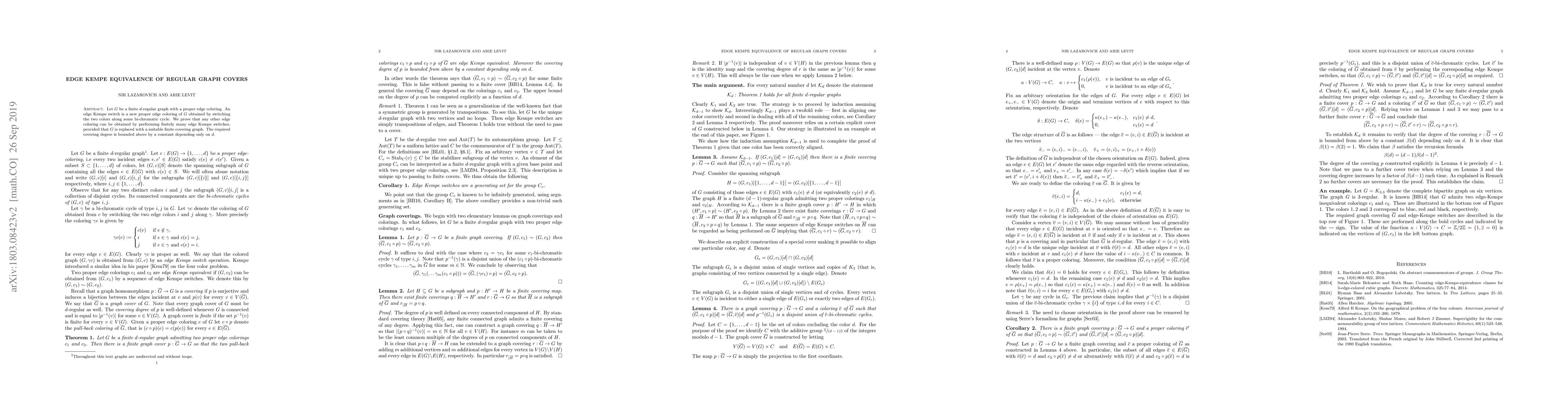Let $G$ be a finite $d$-regular graph with a proper edge coloring. An edge Kempe switch is a new proper edge coloring of $G$ obtained by switching the two colors along some bi-chromatic cycle. We prove that any other edge coloring can be obtained by performing finitely many edge Kempe switches, provided that $G$ is replaced with a suitable finite covering graph. The required covering degree is bounded above by a constant depending only on $d$.