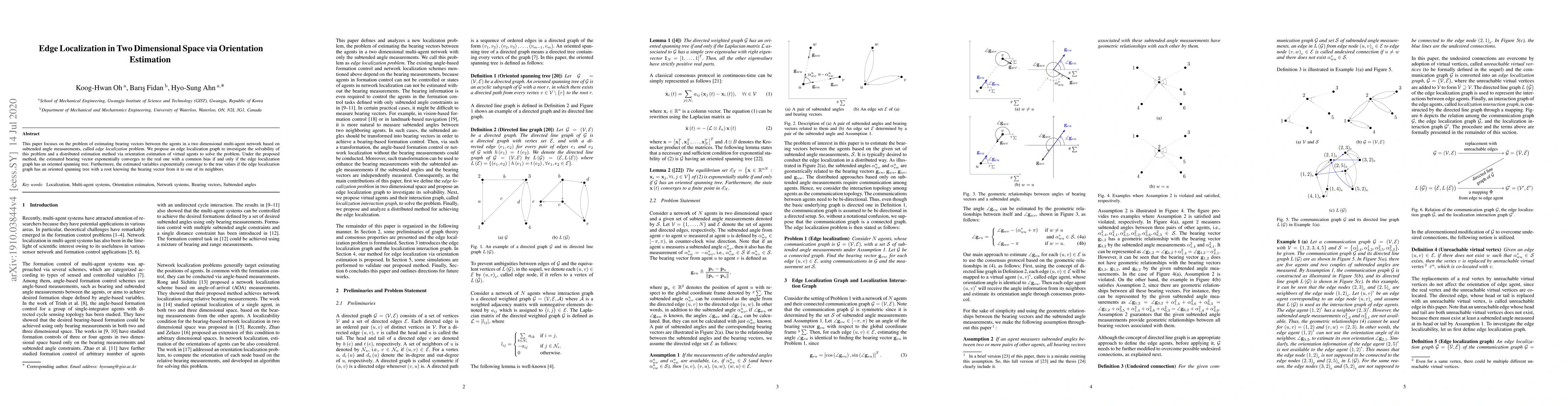 This paper focuses on the problem of estimating bearing vectors between the agents in a two dimensional multi-agent network based on subtended angle measurements, called edge localization problem. We propose an edge localization graph to investigate the solvability of this problem and a distributed estimation method via orientation estimation of virtual agents to solve the problem. Under the proposed method, the estimated bearing vector exponentially converges to the real one with a common bias if and only if the edge localization graph has an oriented spanning tree. Furthermore, the estimated variables exponentially converge to the true values if the edge localization graph has an oriented spanning tree with a root knowing the bearing vector from it to one of its neighbors.