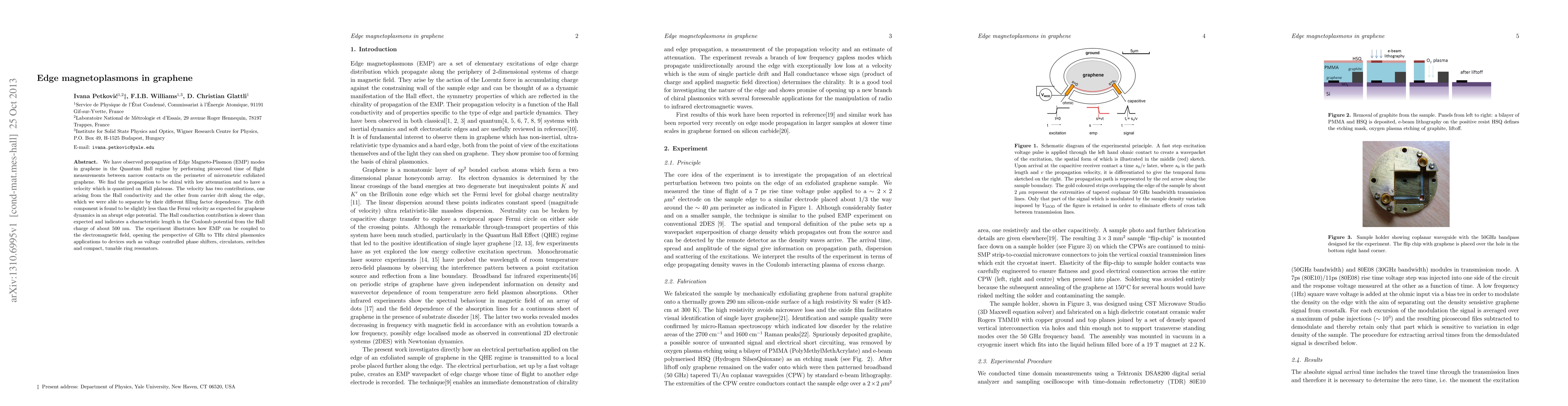 We have observed propagation of Edge Magneto-Plasmon (EMP) modes in graphene in the Quantum Hall regime by performing picosecond time of flight measurements between narrow contacts on the perimeter of micrometric exfoliated graphene. We find the propagation to be chiral with low attenuation and to have a velocity which is quantized on Hall plateaus. The velocity has two contributions, one arising from the Hall conductivity and the other from carrier drift along the edge, which we were able to separate by their different filling factor dependence. The drift component is found to be slightly less than the Fermi velocity as expected for graphene dynamics in an abrupt edge potential. The Hall conduction contribution is slower than expected and indicates a characteristic length in the Coulomb potential from the Hall charge of about 500 nm. The experiment illustrates how EMP can be coupled to the electromagnetic field, opening the perspective of GHz to THz chiral plasmonics applications to devices such as voltage controlled phase shifters, circulators, switches and compact, tunable ring resonators.