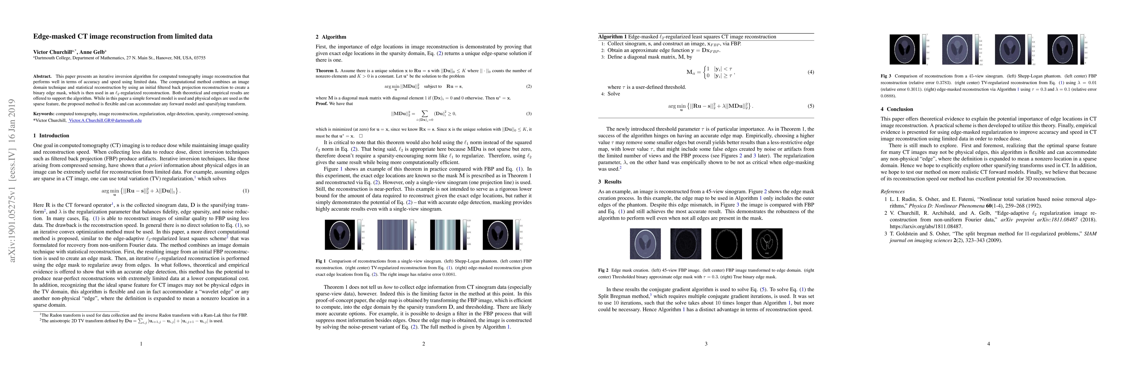 This paper presents an iterative inversion algorithm for computed tomography image reconstruction that performs well in terms of accuracy and speed using limited data. The computational method combines an image domain technique and statistical reconstruction by using an initial filtered back projection reconstruction to create a binary edge mask, which is then used in an l2-regularized reconstruction. Both theoretical and empirical results are offered to support the algorithm. While in this paper a simple forward model is used and physical edges are used as the sparse feature, the proposed method is flexible and can accommodate any forward model and sparsifying transform.