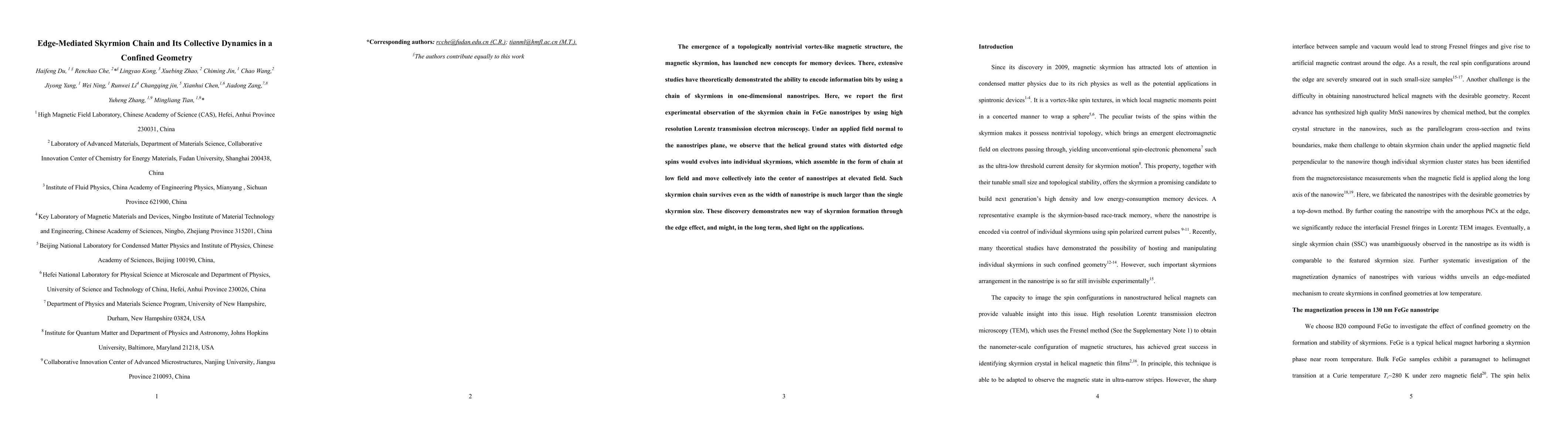 This paper reports the first experimental observation of skyrmion chains in FeGe nanostripes using high-resolution Lorentz transmission electron microscopy, revealing that edge-mediated effects can form these chains, which move collectively under applied fields. This discovery provides new insights into skyrmion formation and potential applications in memory devices.