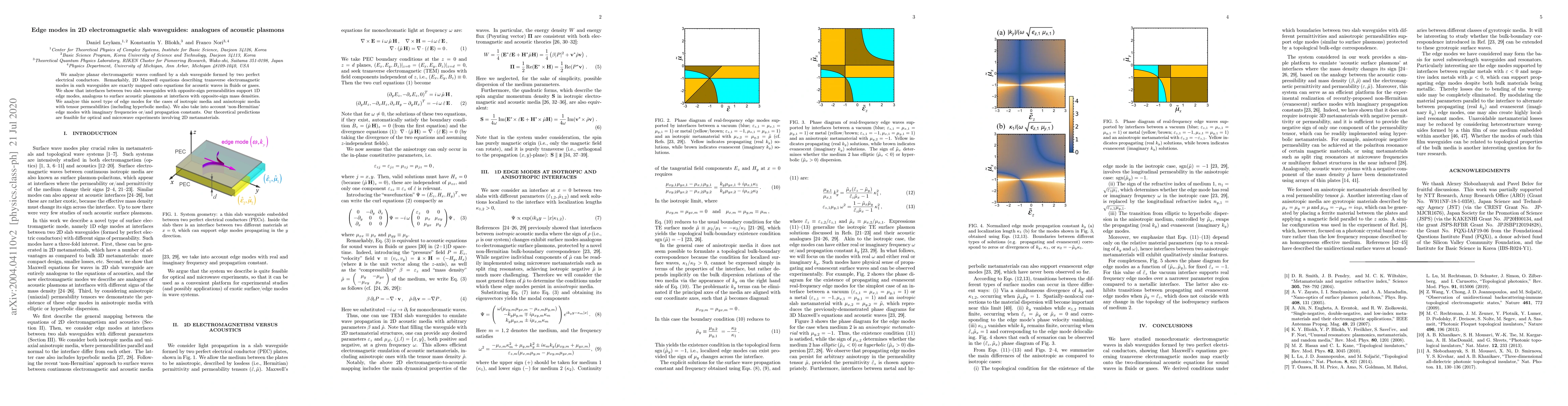 This paper investigates electromagnetic edge modes in 2D slab waveguides, demonstrating their analogy to acoustic plasmons. It shows that these edge modes arise at interfaces between waveguides with opposite-sign permeabilities, extending the analysis to both isotropic and anisotropic media, including hyperbolic materials, and considering non-Hermitian effects.