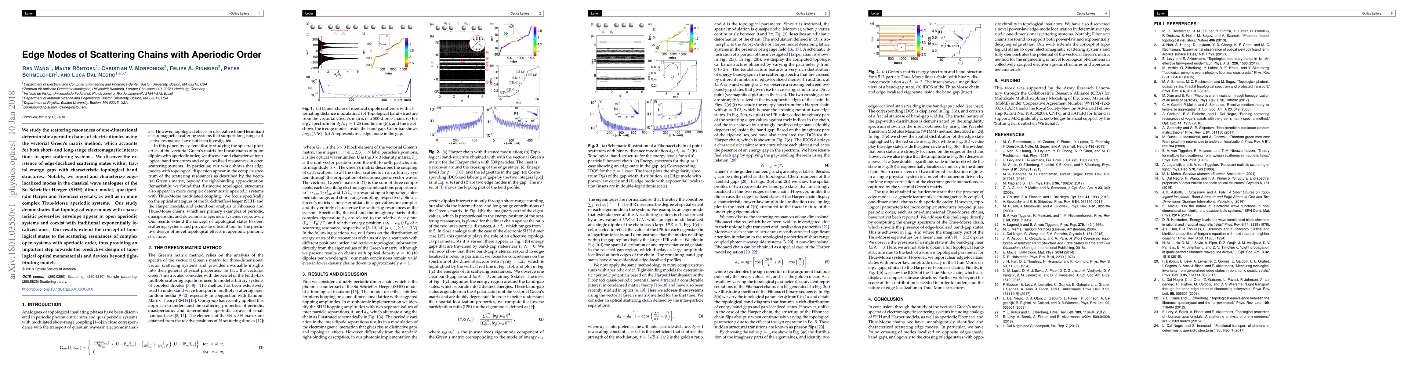 We study the scattering resonances of one-dimensional deterministic aperiodic chains of electric dipoles using the vectorial Green's matrix method, which accounts for both short- and long-range electromagnetic interactions in open scattering systems. We discover the existence of edge-localized scattering states within fractal energy gaps with characteristic topological band structures. Notably, we report and characterize edge-localized modes in the classical wave analogues of the Su-Schrieffer-Heeger (SHH) dimer model, quasiperiodic Harper and Fibonacci crystals, as well as in more complex Thue-Morse aperiodic systems. Our study demonstrates that topological edge-modes with characteristic power-law envelope appear in open aperiodic systems and coexist with traditional exponentially localized ones. Our results extend the concept of topological states to the scattering resonances of complex open systems with aperiodic order, thus providing an important step towards the predictive design of topological optical metamaterials and devices beyond tightbinding models.