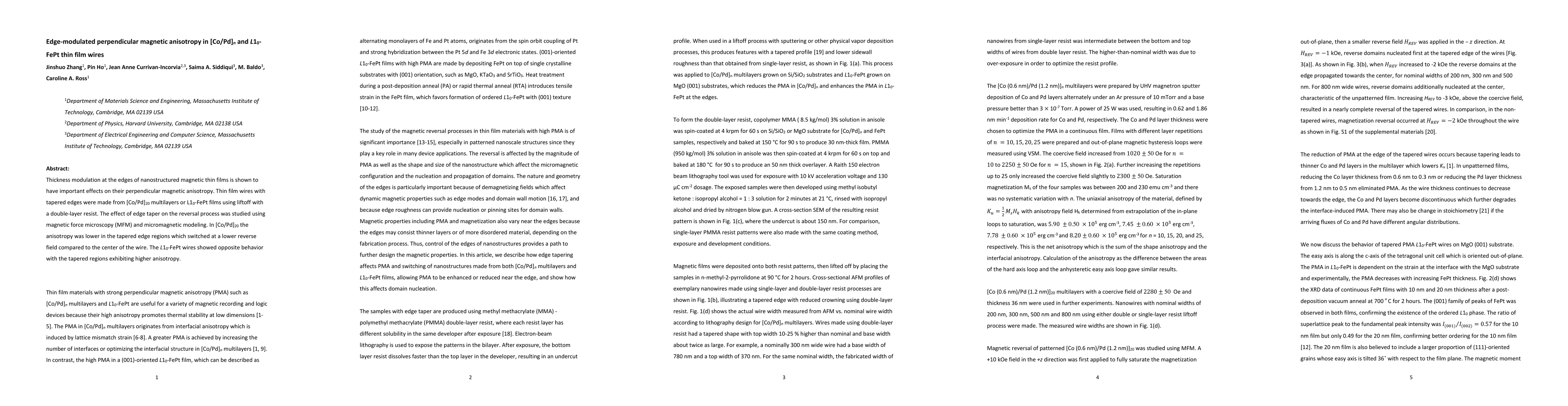 This research investigates the impact of edge thickness modulation on the perpendicular magnetic anisotropy in [Co/Pd]n and L10-FePt thin film wires. The study reveals that tapered edges significantly alter magnetic anisotropy, with [Co/Pd]20 exhibiting lower anisotropy in the tapered regions and L10-FePt showing higher anisotropy in these areas.