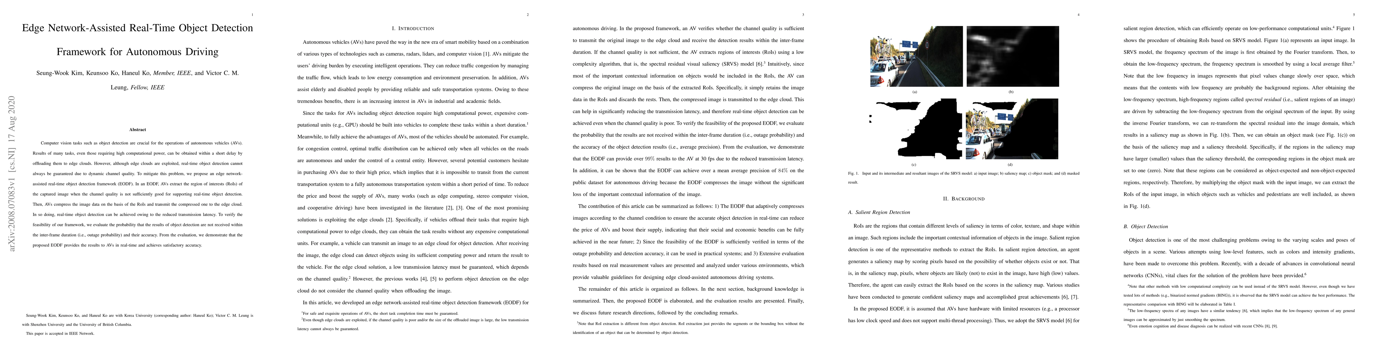 This paper proposes an edge network-assisted real-time object detection framework (EODF) for autonomous vehicles, which offloads high-computation tasks to edge clouds to ensure real-time detection despite dynamic channel conditions. The framework achieves this by compressing image data based on regions of interest when channel quality is insufficient, demonstrating real-time performance and satisfactory accuracy.