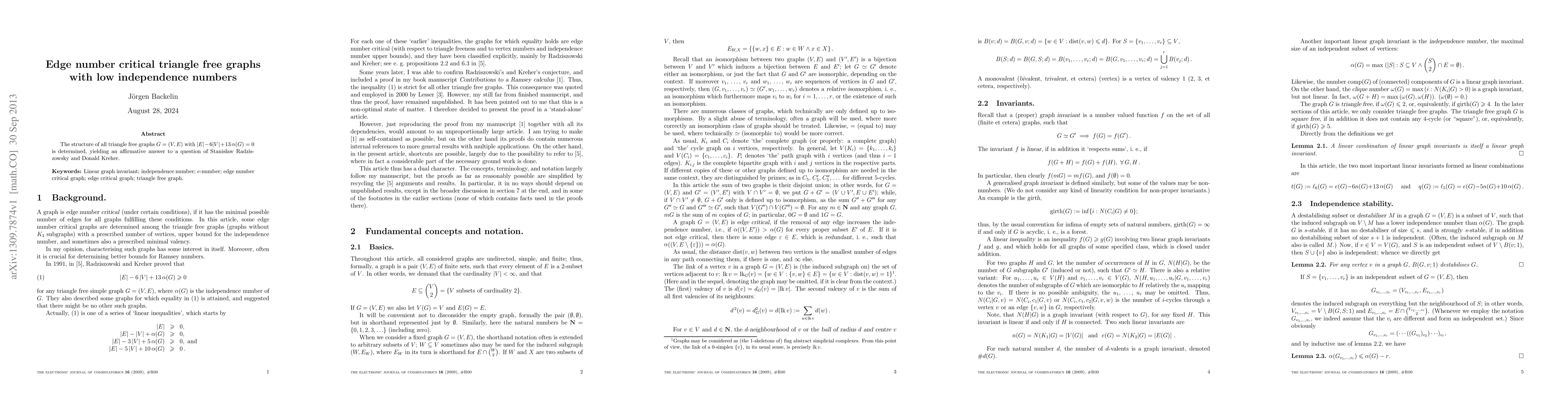 The structure of all triangle free graphs G = (V,E) with |E| - 6|V| + 13\alpha(G) = 0 is determined, yielding an affirmative answer to a question of Stanis{\l}aw Radziszowski and Donald Kreher.