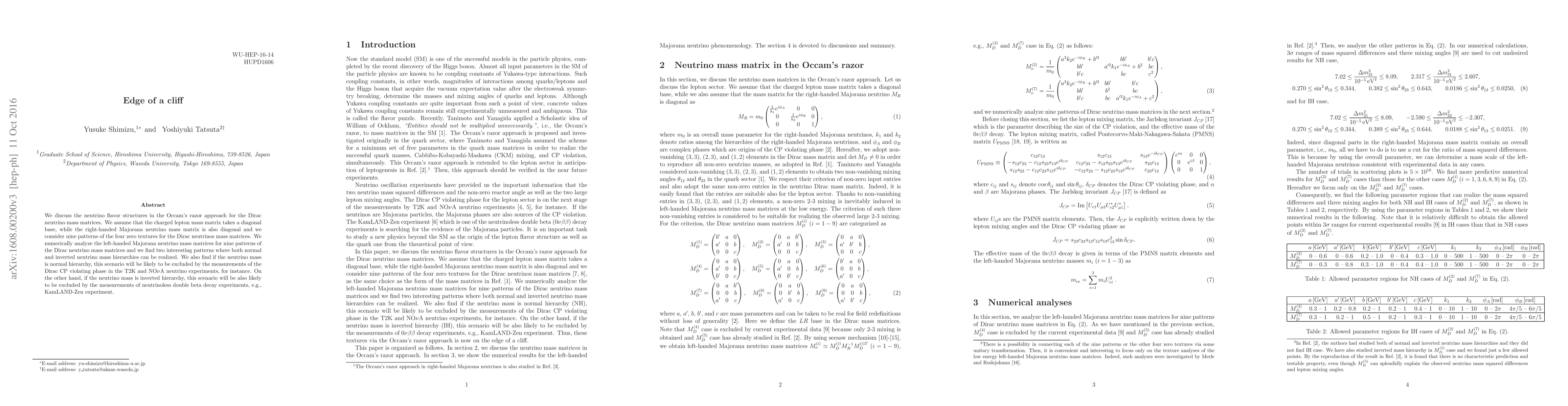 We discuss the neutrino flavor structures in the Occam's razor approach for the Dirac neutrino mass matrices. We assume that the charged lepton mass matrix takes a diagonal base, while the right-handed Majorana neutrino mass matrix is also diagonal and we consider nine patterns of the four zero textures for the Dirac neutrinos mass matrices. We numerically analyze the left-handed Majorana neutrino mass matrices for nine patterns of the Dirac neutrino mass matrices and we found two interesting patterns where both normal and inverted neutrino mass hierarchies can be realized. We also found if the neutrino mass is normal hierarchy, this scenario will be likely to be excluded by the measurements of the Dirac CP violating phase in the T2K and NO$\nu $A neutrino experiments, for instance. On the other hand, if the neutrino mass is inverted hierarchy, this scenario will be also likely to be excluded by the measurements of neutrinoless double beta decay experiments, e.g., KamLAND-Zen experiment.