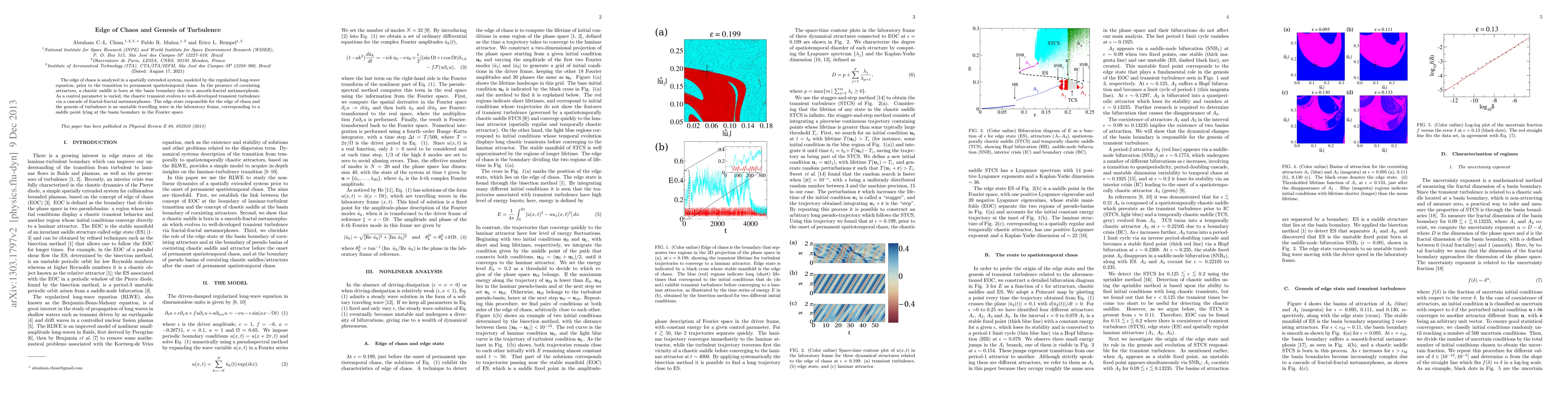 This paper investigates the edge of chaos in a spatially extended system using the regularized long-wave equation, revealing how a chaotic saddle emerges at the basin boundary. The study shows that transient turbulence develops through a cascade of fractal-fractal metamorphoses, with the genesis of turbulence linked to an unstable travelling wave in the laboratory frame.