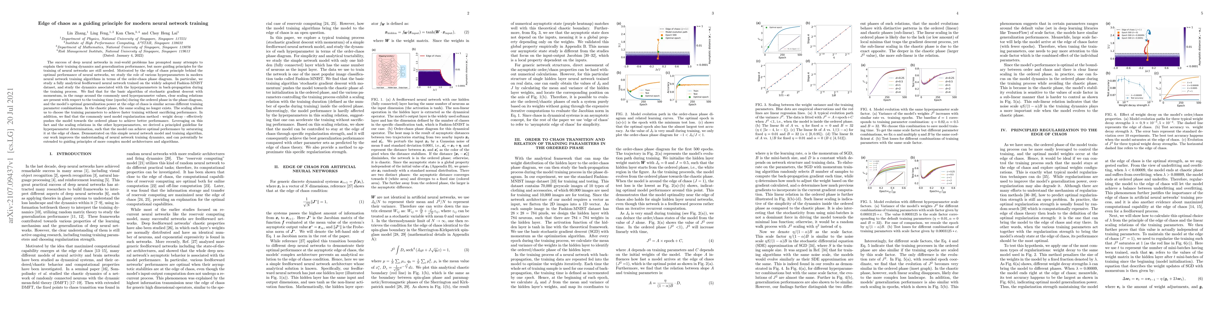 This paper explores the edge of chaos principle to optimize neural network training, finding that hyperparameters like learning rate and momentum exhibit scaling relations near the optimal performance point. The study demonstrates that weight decay can push the model towards the ordered phase, offering a guideline for hyperparameter tuning to achieve faster training without compromising generalization.