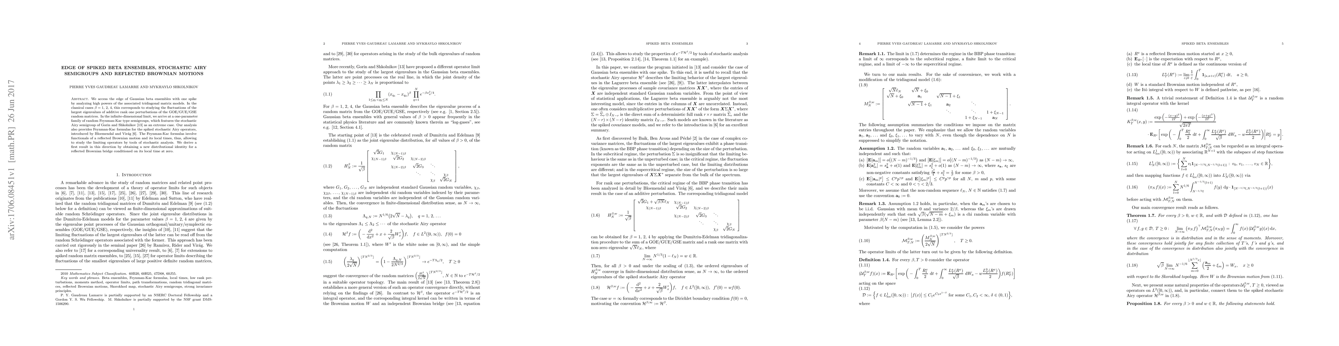 We access the edge of Gaussian beta ensembles with one spike by analyzing high powers of the associated tridiagonal matrix models. In the classical cases beta=1, 2, 4, this corresponds to studying the fluctuations of the largest eigenvalues of additive rank one perturbations of the GOE/GUE/GSE random matrices. In the infinite-dimensional limit, we arrive at a one-parameter family of random Feynman-Kac type semigroups, which features the stochastic Airy semigroup of Gorin and Shkolnikov [13] as an extreme case. Our analysis also provides Feynman-Kac formulas for the spiked stochastic Airy operators, introduced by Bloemendal and Virag [6]. The Feynman-Kac formulas involve functionals of a reflected Brownian motion and its local times, thus, allowing to study the limiting operators by tools of stochastic analysis. We derive a first result in this direction by obtaining a new distributional identity for a reflected Brownian bridge conditioned on its local time at zero.