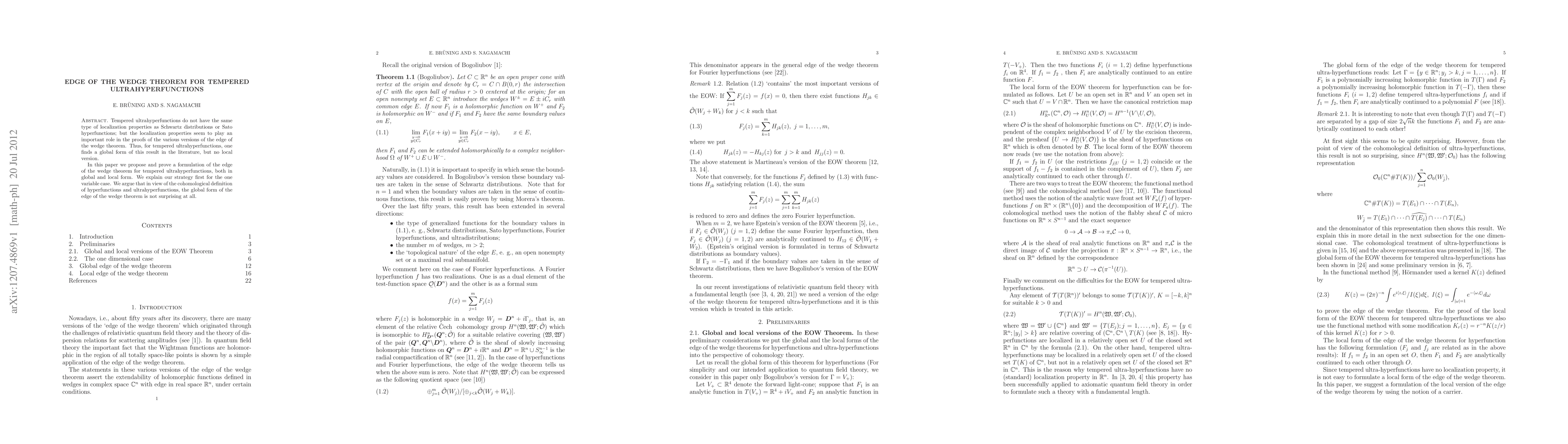 This paper proposes and proves a local and global version of the edge of the wedge theorem for tempered ultra-hyperfunctions, addressing their unique localization properties. The authors explain the strategy using the cohomological definition of these hyperfunctions, highlighting the significance of their findings.