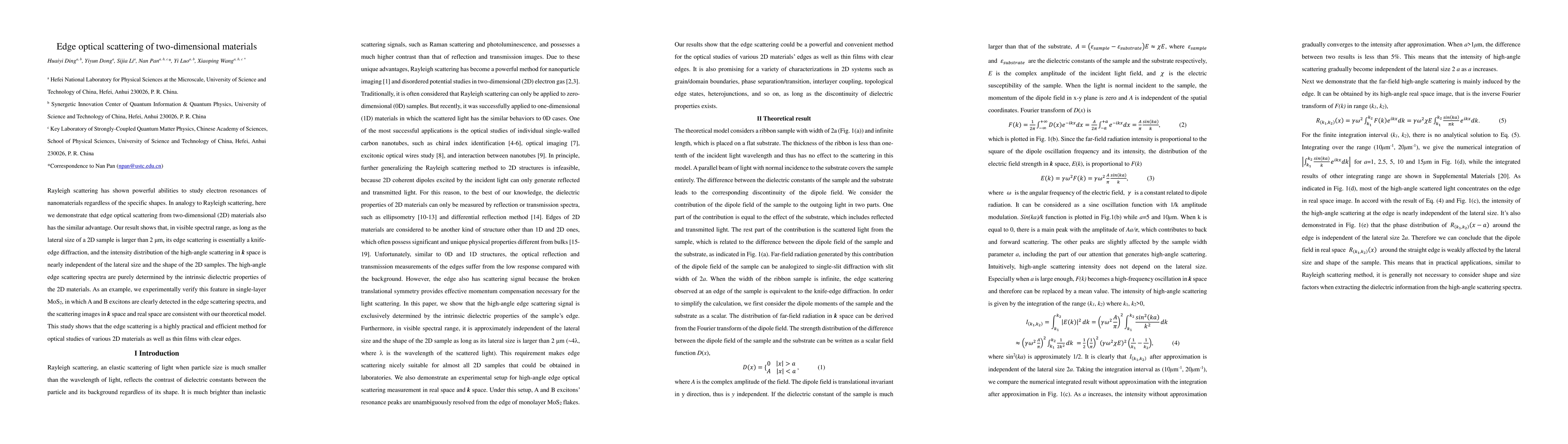 Rayleigh scattering has shown powerful abilities to study electron resonances of nanomaterials regardless of the specific shapes. In analogy to Rayleigh scattering, here we demonstrate that edge optical scattering from two-dimensional (2D) materials also has the similar advantage. Our result shows that, in visible spectral range, as long as the lateral size of a 2D sample is larger than 2 {\mu}m, its edge scattering is essentially a knife-edge diffraction, and the intensity distribution of the high-angle scattering in $\mathbf{k}$ space is nearly independent of the lateral size and the shape of the 2D samples. The high-angle edge scattering spectra are purely determined by the intrinsic dielectric properties of the 2D materials. As an example, we experimentally verify this feature in single-layer $MoS_{2}$, in which A and B excitons are clearly detected in the edge scattering spectra, and the scattering images in $\mathbf{k}$ space and real space are consistent with our theoretical model. This study shows that the edge scattering is a highly practical and efficient method for optical studies of various 2D materials as well as thin films with clear edges.
