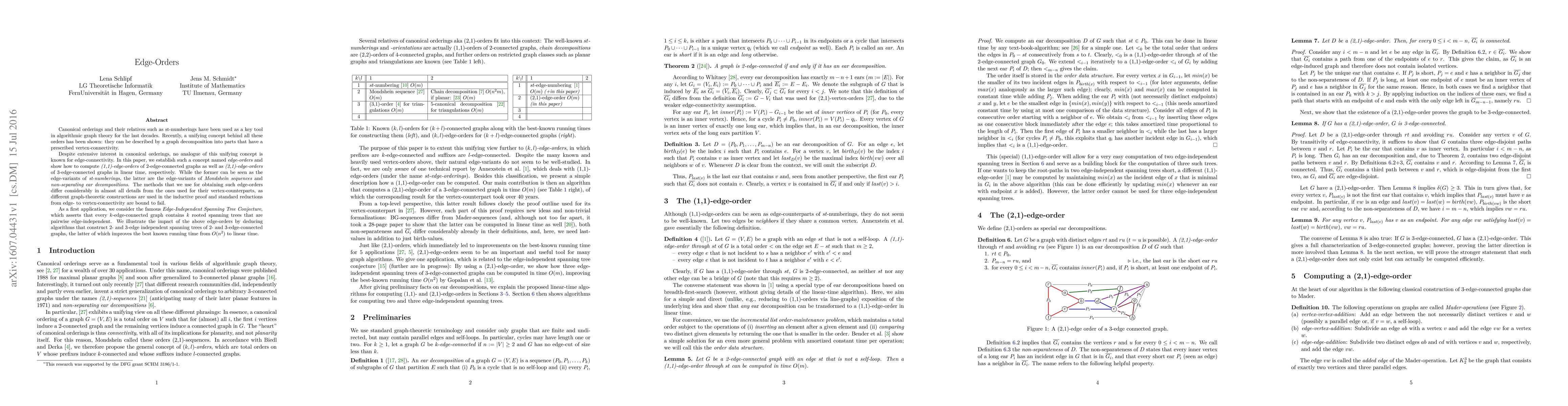 Canonical orderings and their relatives such as st-numberings have been used as a key tool in algorithmic graph theory for the last decades. Recently, a unifying concept behind all these orders has been shown: they can be described by a graph decomposition into parts that have a prescribed vertex-connectivity. Despite extensive interest in canonical orderings, no analogue of this unifying concept is known for edge-connectivity. In this paper, we establish such a concept named edge-orders and show how to compute (1,1)-edge-orders of 2-edge-connected graphs as well as (2,1)-edge-orders of 3-edge-connected graphs in linear time, respectively. While the former can be seen as the edge-variants of st-numberings, the latter are the edge-variants of Mondshein sequences and non-separating ear decompositions. The methods that we use for obtaining such edge-orders differ considerably in almost all details from the ones used for their vertex-counterparts, as different graph-theoretic constructions are used in the inductive proof and standard reductions from edge- to vertex-connectivity are bound to fail. As a first application, we consider the famous Edge-Independent Spanning Tree Conjecture, which asserts that every k-edge-connected graph contains k rooted spanning trees that are pairwise edge-independent. We illustrate the impact of the above edge-orders by deducing algorithms that construct 2- and 3-edge independent spanning trees of 2- and 3-edge-connected graphs, the latter of which improves the best known running time from O(n^2) to linear time.
