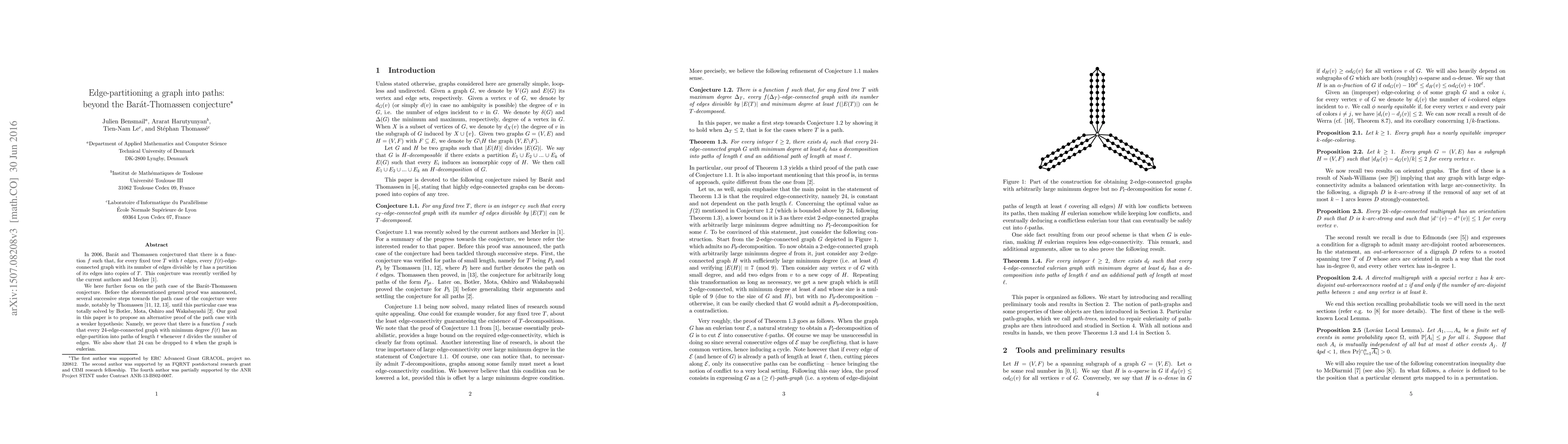 The Bar\'at-Thomassen conjecture asserts that there is a function $f$ such that for every fixed tree $T$ with $t$ edges, every graph which is $f(t)$-edge-connected with its number of edges divisible by $t$ has a partition of its edges into copies of $T$. This has been proved in the case of paths of length $2^k$ by Thomassen, and recently shown to be true for all paths by Botler, Mota, Oshiro and Wakabayashi. Our goal in this paper is to propose an alternative proof of the path case with a weaker hypothesis: Namely, we prove that there is a function $f$ such that every $24$-edge-connected graph with minimum degree $f(t)$ has an edge-partition into paths of length $t$ whenever $t$ divides the number of edges. We also show that $24$ can be dropped to $4$ when the graph is eulerian.