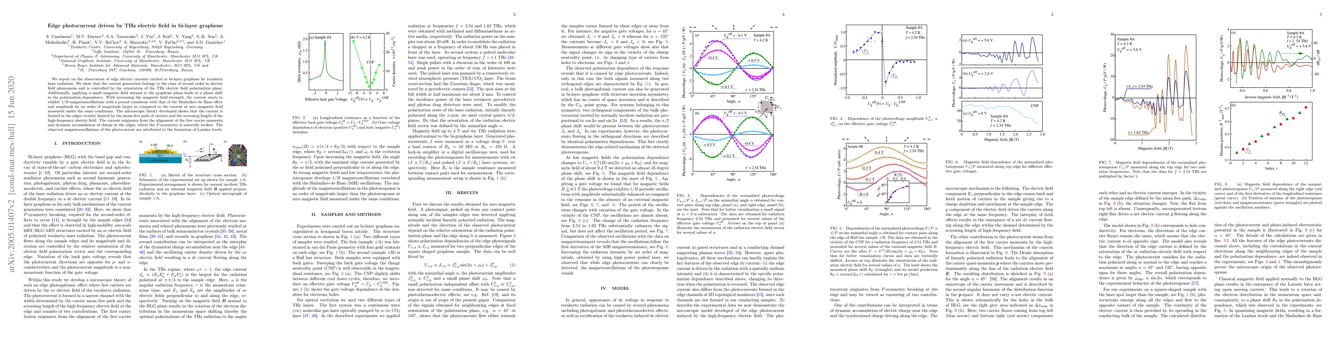 This paper reports on the generation of edge electric currents in bi-layer graphene driven by terahertz laser radiation, exhibiting second-order electric field effects and polarization dependence. The study reveals that magnetooscillations in the current arise due to the formation of Landau levels under a perpendicular magnetic field.