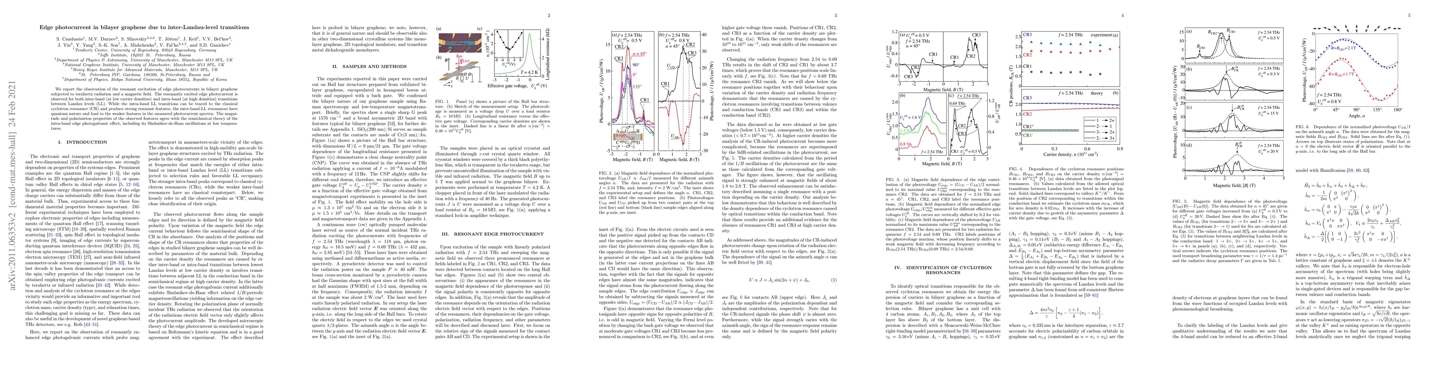 This paper reports the observation of resonant edge photocurrents in bilayer graphene under terahertz radiation and a magnetic field, revealing both inter-band and intra-band transitions between Landau levels. The intra-band transitions show strong resonant features linked to cyclotron resonance, while the inter-band transitions exhibit weaker quantum-nature resonances, consistent with the semiclassical theory of the intra-band edge photogalvanic effect.