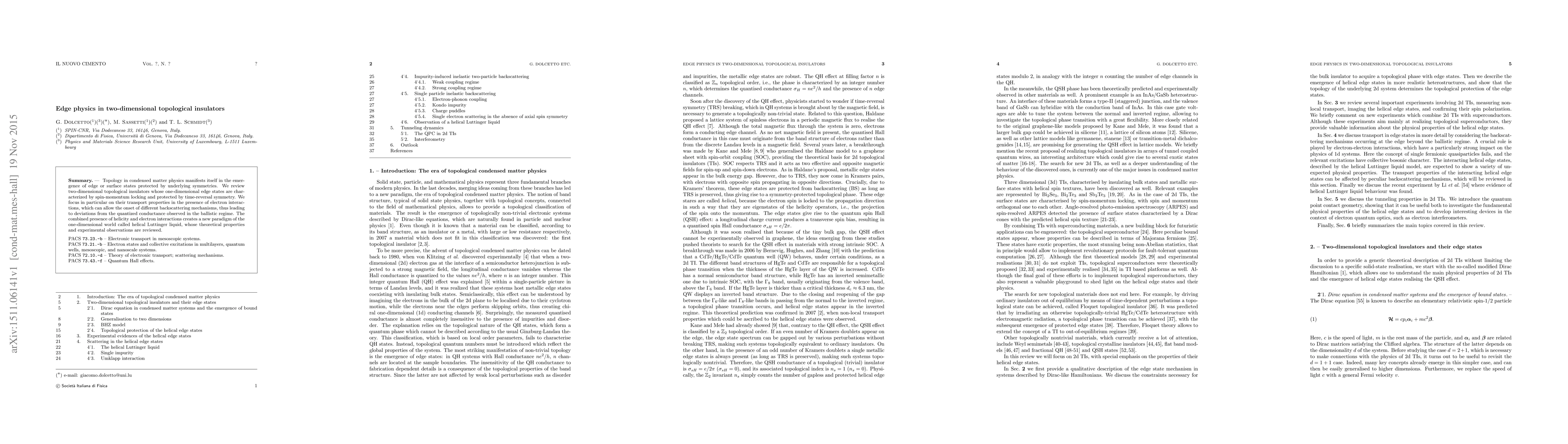 This paper reviews the edge physics of two-dimensional topological insulators, focusing on their spin-momentum locked edge states protected by time-reversal symmetry. It examines how electron interactions can lead to backscattering mechanisms and deviations from quantized conductance, introducing the concept of the helical Luttinger liquid.