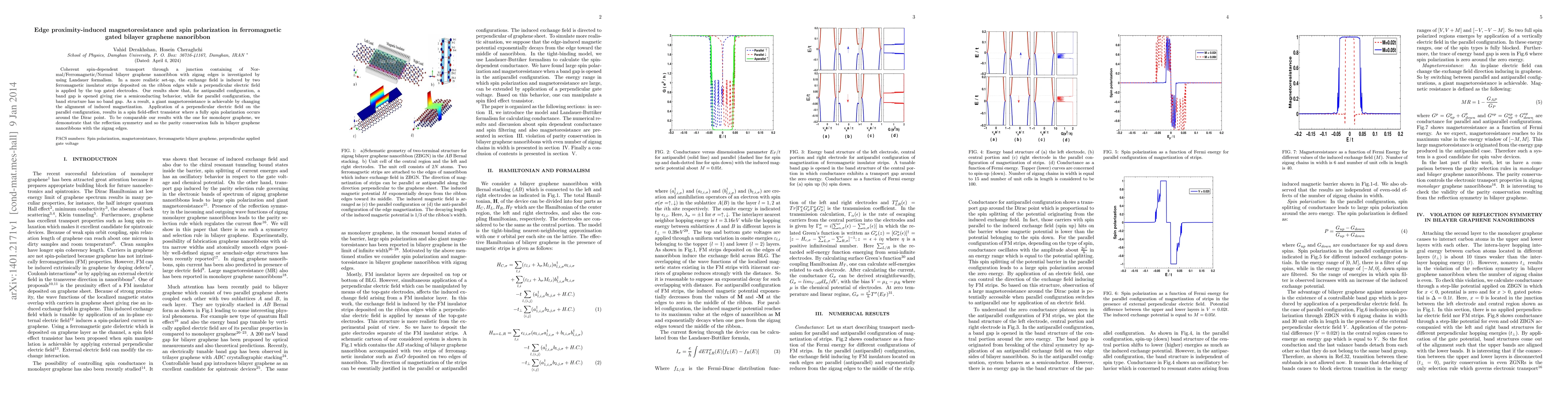 This paper investigates spin-dependent transport in ferromagnetic gated bilayer graphene nanoribbons, showing that antiparallel magnetization configurations open a band gap, leading to semiconducting behavior and giant magnetoresistance. A perpendicular electric field induces fully spin-polarized transport in parallel configurations, highlighting the failure of reflection symmetry in zigzag bilayer graphene nanoribbons.