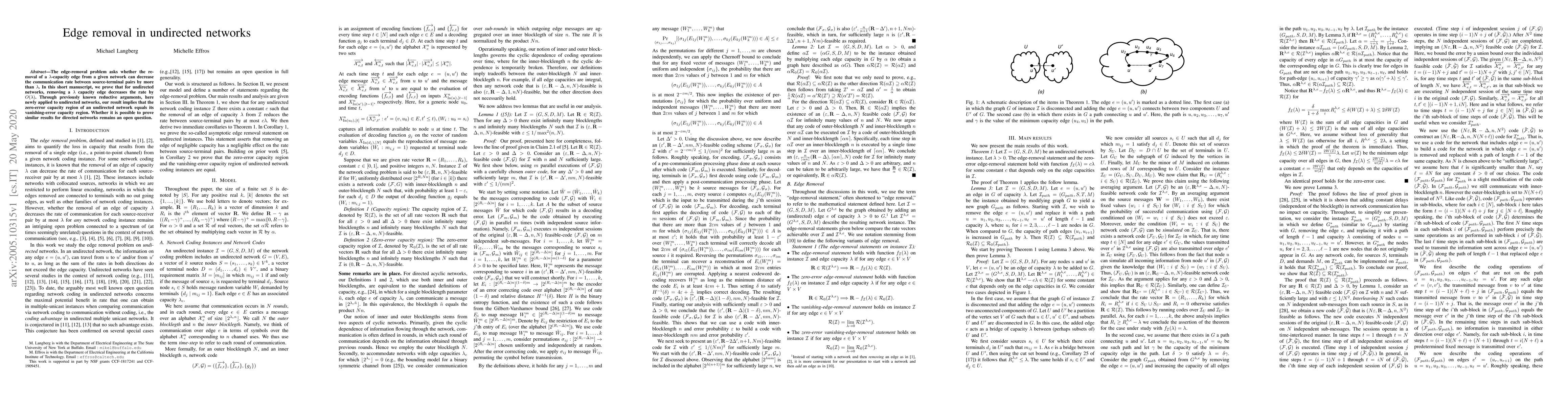 The edge-removal problem asks whether the removal of a $\lambda$-capacity edge from a given network can decrease the communication rate between source-terminal pairs by more than $\lambda$. In this short manuscript, we prove that for undirected networks, removing a $\lambda$-capacity edge decreases the rate by $O(\lambda)$. Through previously known reductive arguments, here newly applied to undirected networks, our result implies that the zero-error capacity region of an undirected network equals its vanishing-error capacity region. Whether it is possible to prove similar results for directed networks remains an open question.