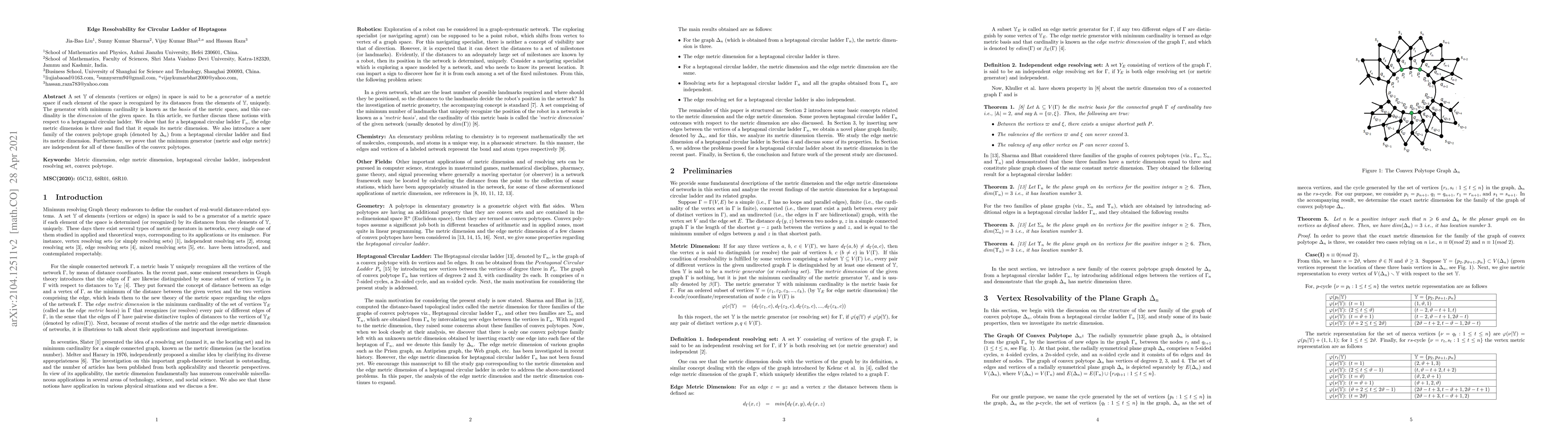 This paper investigates the edge resolvability of a heptagonal circular ladder $\Gamma_{n}$, demonstrating that its edge metric dimension is three, equal to its metric dimension. It also introduces a new family of convex polytope graphs $\Delta_{n}$ derived from $\Gamma_{n}$ and proves that the minimum metric and edge metric generators are independent for these families.