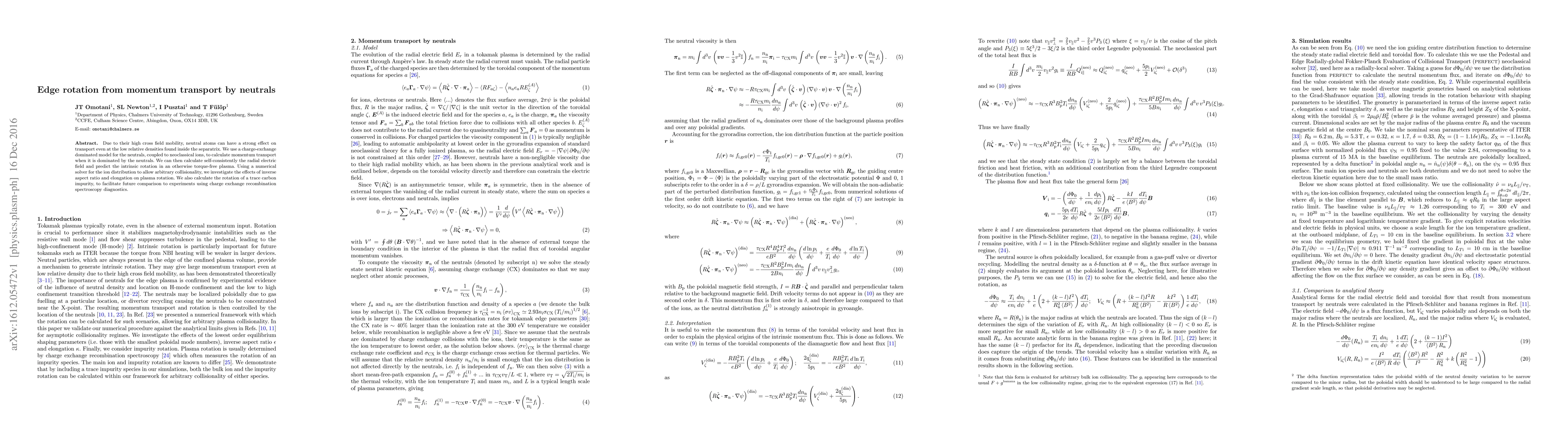 Due to their high cross field mobility, neutral atoms can have a strong effect on transport even at the low relative densities found inside the separatrix. We use a charge-exchange dominated model for the neutrals, coupled to neoclassical ions, to calculate momentum transport when it is dominated by the neutrals. We can then calculate self-consistently the radial electric field and predict the intrinsic rotation in an otherwise torque-free plasma. Using a numerical solver for the ion distribution to allow arbitrary collisionality, we investigate the effects of inverse aspect ratio and elongation on plasma rotation. We also calculate the rotation of a trace carbon impurity, to facilitate future comparison to experiments using charge exchange recombination spectroscopy diagnostics.