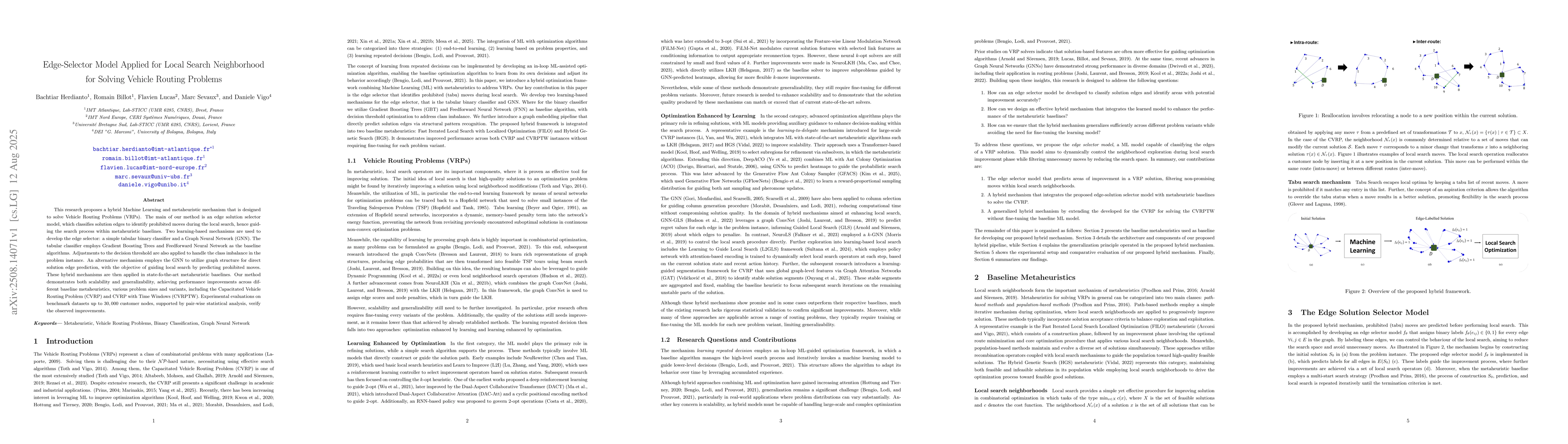 This research proposes a hybrid Machine Learning and metaheuristic mechanism that is designed to solve Vehicle Routing Problems (VRPs). The main of our method is an edge solution selector model, which classifies solution edges to identify prohibited moves during the local search, hence guiding the search process within metaheuristic baselines. Two learning-based mechanisms are used to develop the edge selector: a simple tabular binary classifier and a Graph Neural Network (GNN). The tabular classifier employs Gradient Boosting Trees and Feedforward Neural Network as the baseline algorithms. Adjustments to the decision threshold are also applied to handle the class imbalance in the problem instance. An alternative mechanism employs the GNN to utilize graph structure for direct solution edge prediction, with the objective of guiding local search by predicting prohibited moves. These hybrid mechanisms are then applied in state-fo-the-art metaheuristic baselines. Our method demonstrates both scalability and generalizability, achieving performance improvements across different baseline metaheuristics, various problem sizes and variants, including the Capacitated Vehicle Routing Problem (CVRP) and CVRP with Time Windows (CVRPTW). Experimental evaluations on benchmark datasets up to 30,000 customer nodes, supported by pair-wise statistical analysis, verify the observed improvements.