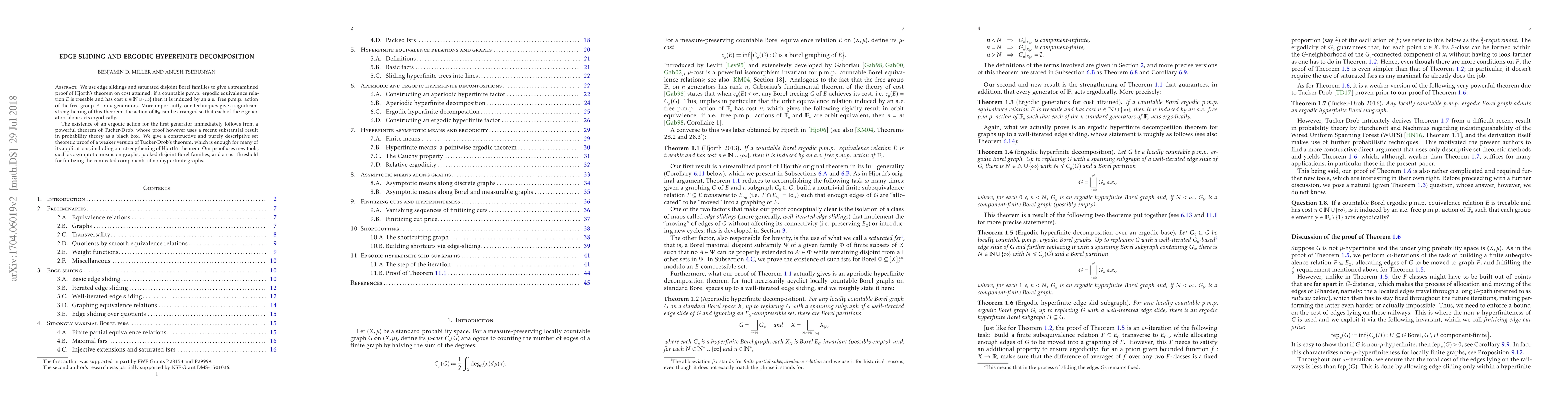 We use edge slidings and saturated disjoint Borel families to give a conceptually simple proof of Hjorth's theorem on cost attained: if a countable p.m.p. ergodic equivalence relation $E$ is treeable and has cost $n \in \mathbb{N} \cup \{\infty\}$ then it is induced by an a.e. free p.m.p. action of the free group $\mathbb{F}_n$ on $n$ generators. More importantly, our techniques give a significant strengthening of this theorem: the action of $\mathbb{F}_n$ can be arranged so that each of the $n$ generators alone acts ergodically. The existence of an ergodic action for the first generator immediately follows from a powerful theorem of Tucker-Drob, whose proof however uses a recent substantial result in probability theory as a black box. We give a constructive and purely descriptive set theoretic proof of a weaker version of Tucker-Drob's theorem, which is enough for many of its applications, including our strengthening of Hjorth's theorem. Our proof uses new tools, such as asymptotic means on graphs, packed disjoint Borel families, and a cost threshold for finitizing the connected components of nonhyperfinite graphs.