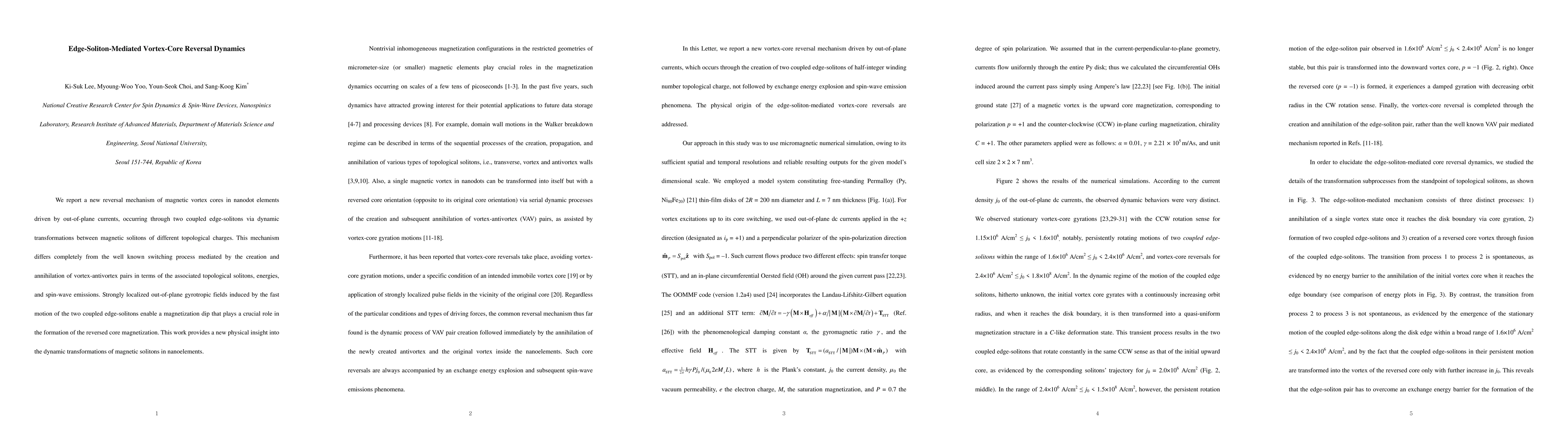 This paper introduces a novel mechanism for reversing magnetic vortex cores in nanodot elements, driven by out-of-plane currents through coupled edge-solitons, differing from traditional vortex-antivortex pair processes. The mechanism involves dynamic transformations between solitons with different topological charges, facilitated by localized gyrotropic fields from the solitons.