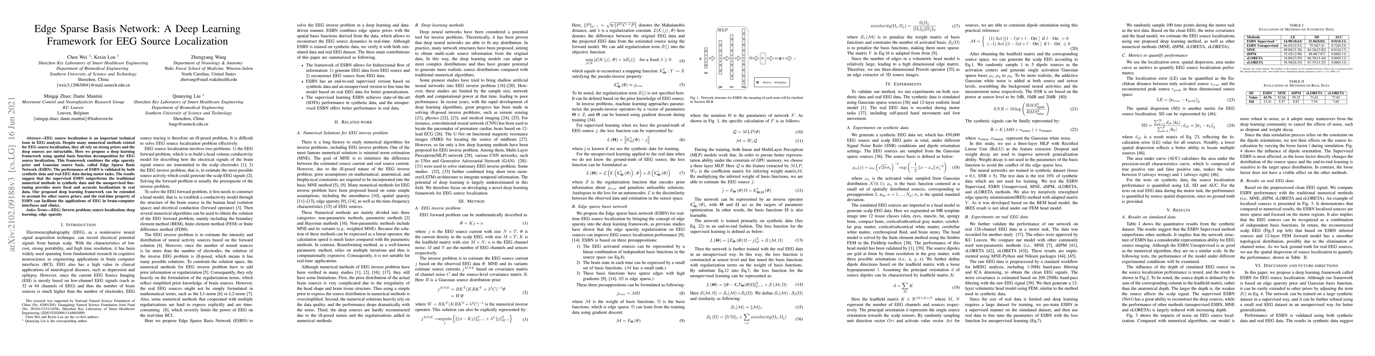 The paper proposes a deep learning framework called Edge Sparse Basis Network (ESBN) for EEG source localization, combining edge sparsity with Gaussian source basis. The ESBN framework outperforms traditional methods in synthetic data and provides more accurate localizations in real EEG data during motor tasks.