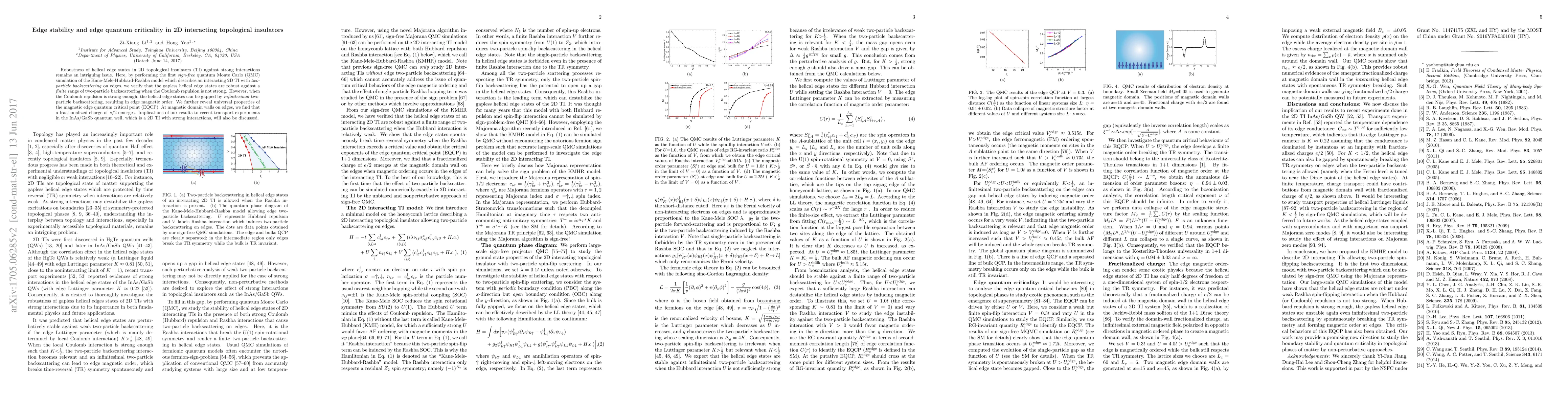 Robustness of helical edge states in 2D topological insulators (TI) against strong interactions remains an intriguing issue. Here, by performing the first sign-free quantum Monte Carlo (QMC) simulation of the Kane-Mele-Hubbard-Rashba model which describes an interacting 2D TI with two-particle backscattering on edges, we verify that the gapless helical edge states are robust against a finite range of two-particle backscattering when the Coulomb repulsion is not strong. However, when the Coulomb repulsion is strong enough, the helical edge states can be gapped by infinitesimal two-particle backscattering, resulting in edge magnetic order. We further reveal universal properties of the magnetic edge quantum critical point (EQCP). At magnetic domain walls on edges, we find that a fractionalized charge of e/2 emerges. Implications of our results to recent transport experiments in the InAs/GaSb quantum well, which is a 2D TI with strong interactions, will also be discussed.