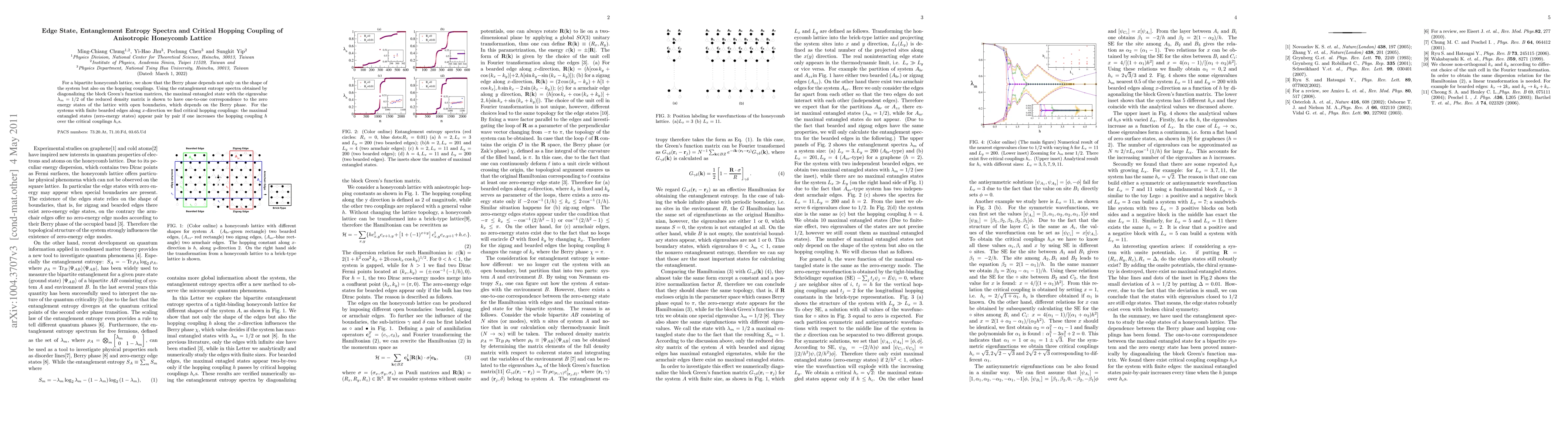 This paper investigates the relationship between the Berry phase and hopping couplings in an anisotropic honeycomb lattice, demonstrating that entanglement entropy spectra correlate with zero-energy edge states. It identifies critical hopping couplings where maximal entangled states emerge in pairs as the hopping coupling exceeds certain thresholds.