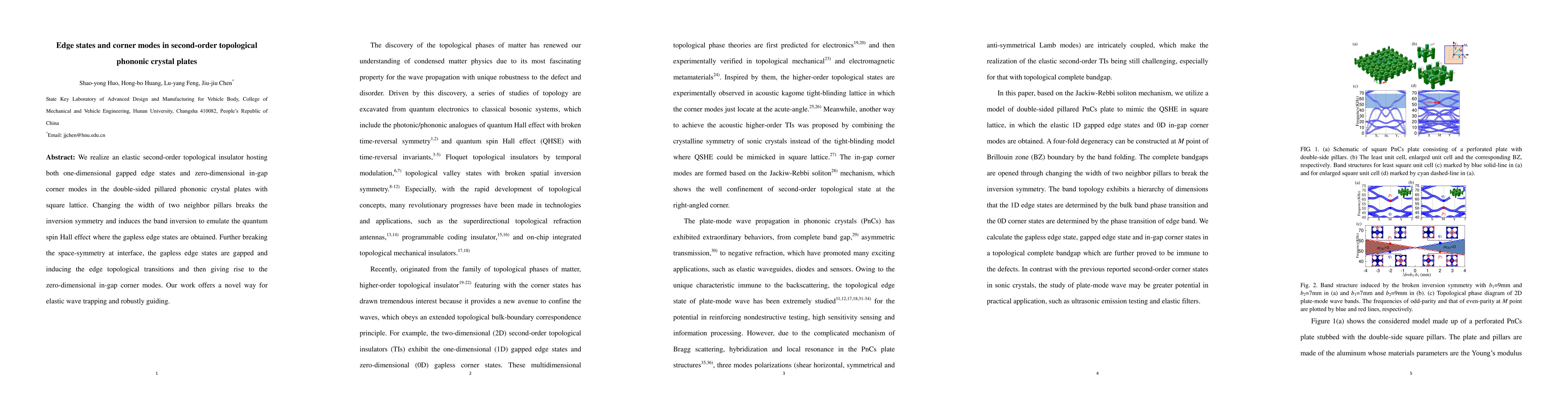 This research demonstrates an elastic second-order topological insulator in phononic crystal plates, exhibiting both edge states and corner modes. By manipulating pillar widths and symmetry, the authors create robust elastic wave trapping and guiding mechanisms.