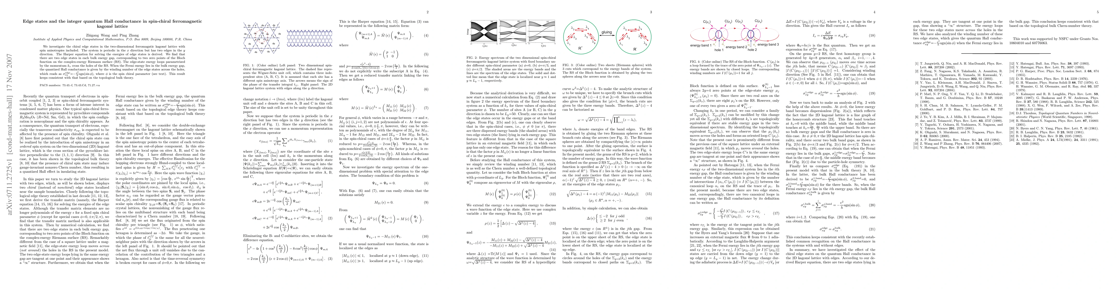 This paper investigates chiral edge states in a spin-chiral ferromagnetic kagome lattice, deriving the Harper equation to determine edge state energies. It finds two edge states per bulk energy gap, leading to quantized integer quantum Hall conductance proportional to the spin chiral parameter.