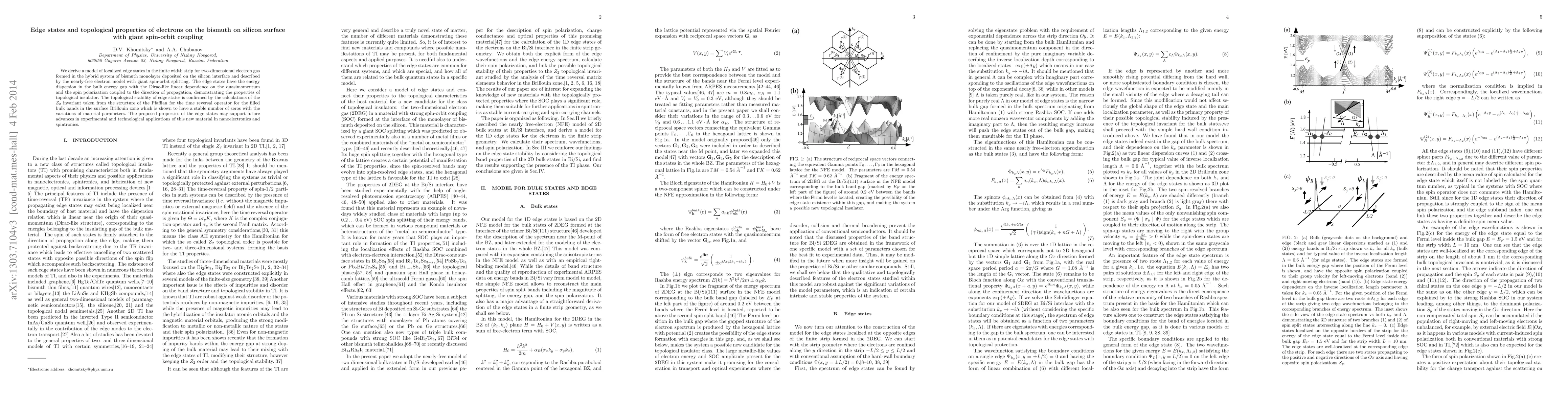 We derive a model of localized edge states in the finite width strip for two-dimensional electron gas formed in the hybrid system of bismuth monolayer deposited on the silicon interface and described by the nearly-free electron model with giant spin-orbit splitting. The edge states have the energy dispersion in the bulk energy gap with the Dirac-like linear dependence on the quasimomentum and the spin polarization coupled to the direction of propagation, demonstrating the properties of topological insulator. The topological stability of edge states is confirmed by the calculations of the $Z_2$ invariant taken from the structure of the Pfaffian for the time reversal operator for the filled bulk bands in the surface Brillouin zone which is shown to have a stable number of zeros with the variations of material parameters. The proposed properties of the edge states may support future advances in experimental and technological applications of this new material in nanoelectronics and spintronics.