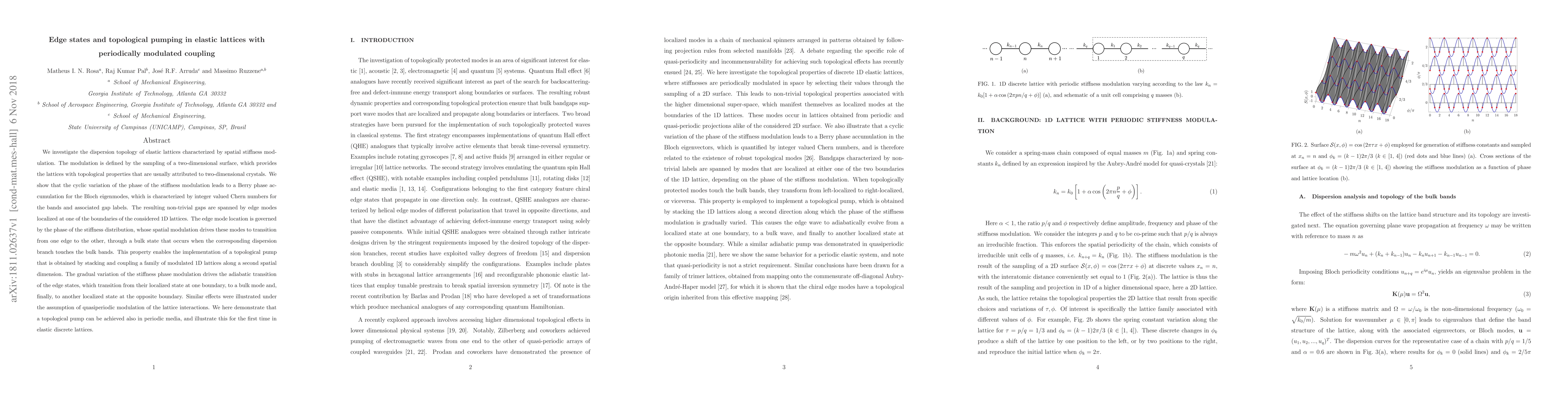 This paper explores the topological properties of elastic lattices with periodically modulated stiffness, showing that spatial modulation leads to non-trivial gaps and edge states. It demonstrates a topological pump effect in these 1D lattices, where edge states transition through bulk states, driven by the modulation phase, achieving an adiabatic transition between boundaries.