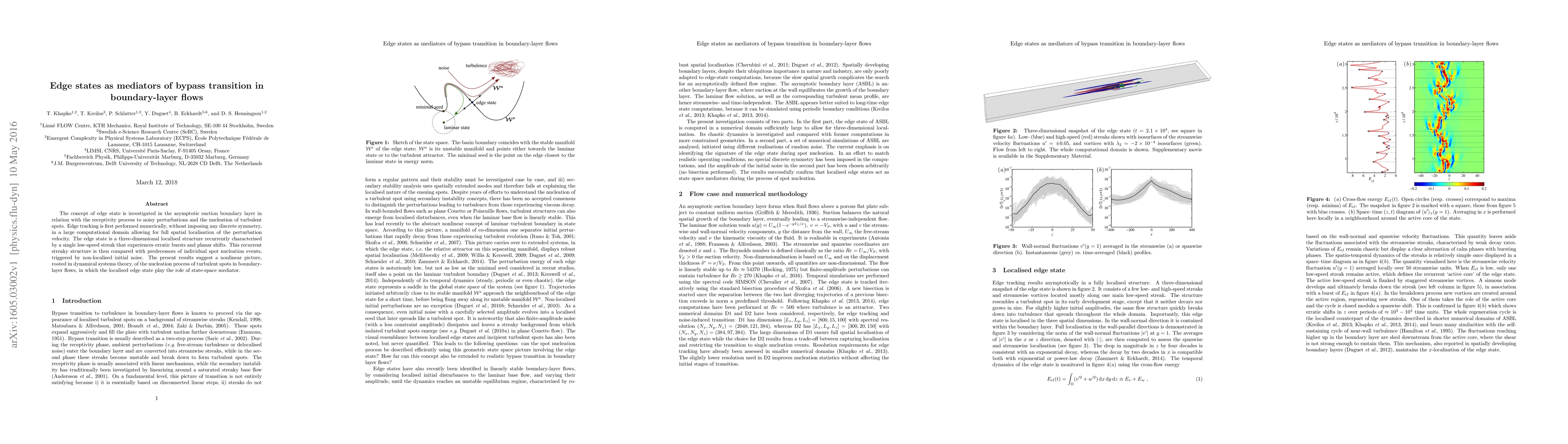 The concept of edge state is investigated in the asymptotic suction boundary layer in relation with the receptivity process to noisy perturbations and the nucleation of turbulent spots. Edge tracking is first performed numerically, without imposing any discrete symmetry, in a large computational domain allowing for full spatial localisation of the perturbation velocity. The edge state is a three-dimensional localised structure recurrently characterised by a single low-speed streak that experiences erratic bursts and planar shifts. This recurrent streaky structure is then compared with predecessors of individual spot nucleation events, triggered by non-localised initial noise. The present results suggest a nonlinear picture, rooted in dynamical systems theory, of the nucleation process of turbulent spots in boundary-layer flows, in which the localised edge state play the role of state-space mediator.