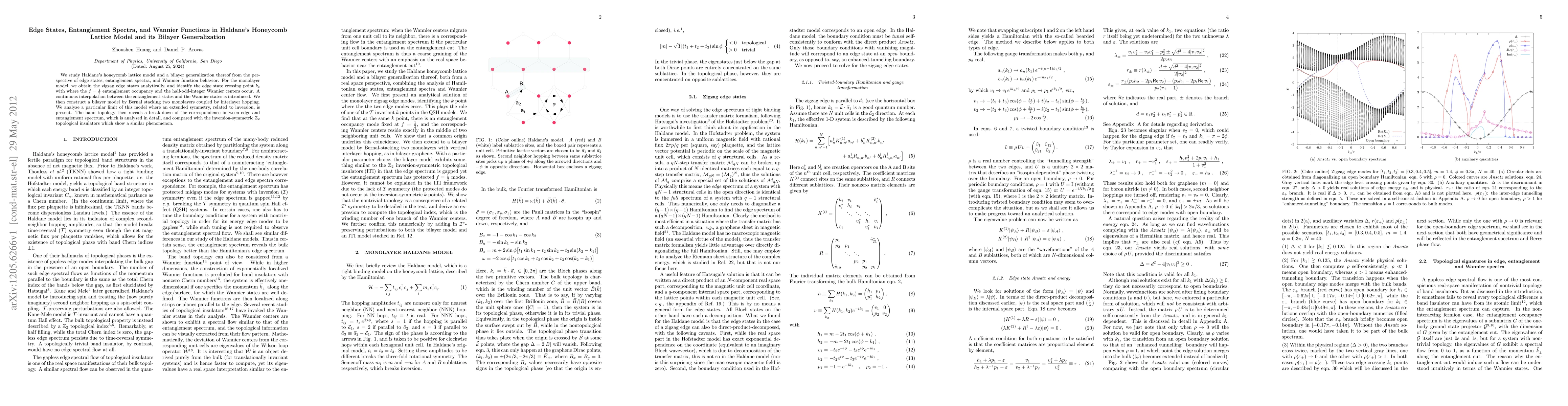 We study Haldane's honeycomb lattice model and a bilayer generalization thereof from the perspective of edge states, entanglement spectra, and Wannier function behavior. For the monolayer model, we obtain the zigzag edge states analytically, and identify the edge state crossing point $k_c$ with where the $f = 1/2$ entanglement occupancy and the half-odd-integer Wannier centers occur. A continuous interpolation between the entanglement states and the Wannier states is introduced. We then construct a bilayer model by Bernal stacking two monolayers coupled by interlayer hopping. We analyze a particular limit of this model where an extended symmetry, related to inversion, is present. The band topology then reveals a break-down of the correspondence between edge and entanglement spectrum, which is analyzed in detail, and compared with the inversion-symmetric Z2 topological insulators which show a similar phenomenon.