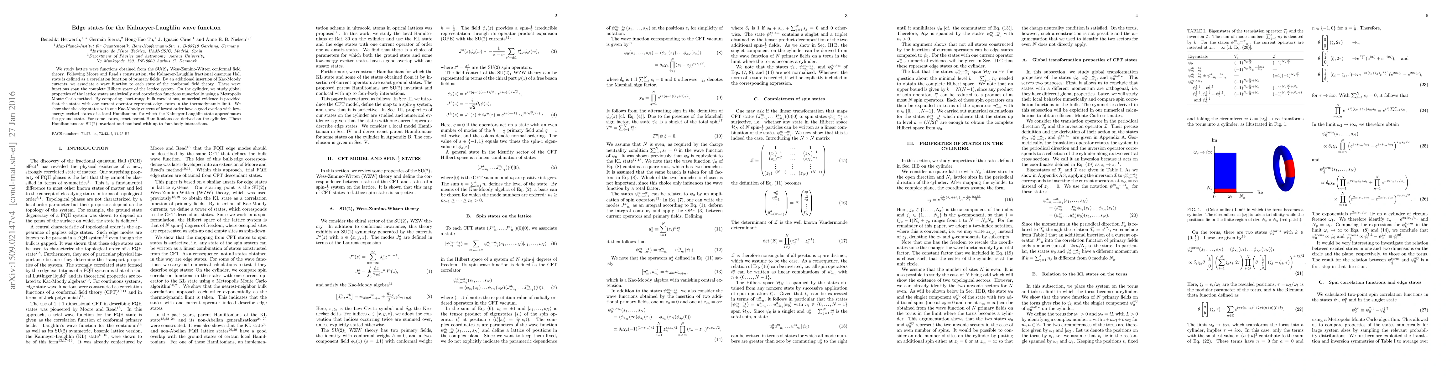 We study lattice wave functions obtained from the SU(2)$_1$ Wess-Zumino-Witten conformal field theory. Following Moore and Read's construction, the Kalmeyer-Laughlin fractional quantum Hall state is defined as a correlation function of primary fields. By an additional insertion of Kac-Moody currents, we associate a wave function to each state of the conformal field theory. These wave functions span the complete Hilbert space of the lattice system. On the cylinder, we study global properties of the lattice states analytically and correlation functions numerically using a Metropolis Monte Carlo method. By comparing short-range bulk correlations, numerical evidence is provided that the states with one current operator represent edge states in the thermodynamic limit. We show that the edge states with one Kac-Moody current of lowest order have a good overlap with low-energy excited states of a local Hamiltonian, for which the Kalmeyer-Laughlin state approximates the ground state. For some states, exact parent Hamiltonians are derived on the cylinder. These Hamiltonians are SU(2) invariant and nonlocal with up to four-body interactions.