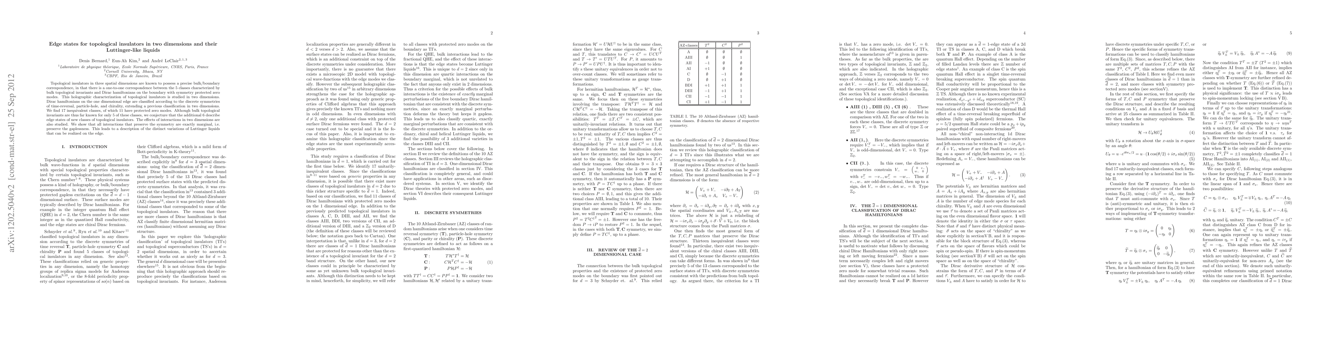 Topological insulators in three spatial dimensions are known to possess a precise bulk/boundary correspondence, in that there is a one-to-one correspondence between the 5 classes characterized by bulk topological invariants and Dirac hamiltonians on the boundary with symmetry protected zero modes. This holographic characterization of topological insulators is studied in two dimensions. Dirac hamiltonians on the one dimensional edge are classified according to the discrete symmetries of time-reversal, particle-hole, and chirality, extending a previous classification in two dimensions. We find 17 inequivalent classes, of which 11 have protected zero modes. Although bulk topological invariants are thus far known for only 5 of these classes, we conjecture that the additional 6 describe edge states of new classes of topological insulators. The effects of interactions in two dimensions are also studied. We show that all interactions that preserve the symmetries are exactly marginal, i.e. preserve the gaplessness. This leads to a description of the distinct variations of Luttinger liquids that can be realized on the edge.