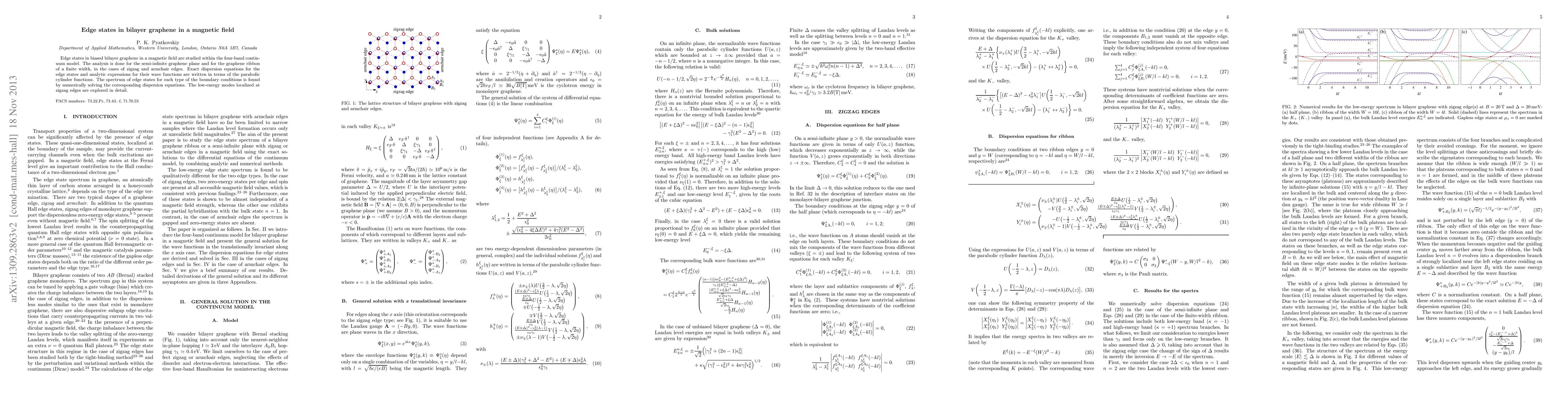 This paper investigates edge states in bilayer graphene under a magnetic field using a four-band continuum model, focusing on both semi-infinite planes and finite-width ribbons with zigzag and armchair edges. Exact dispersion equations and wave functions in terms of parabolic cylinder functions are derived, and numerical analysis reveals detailed low-energy modes localized at zigzag edges.