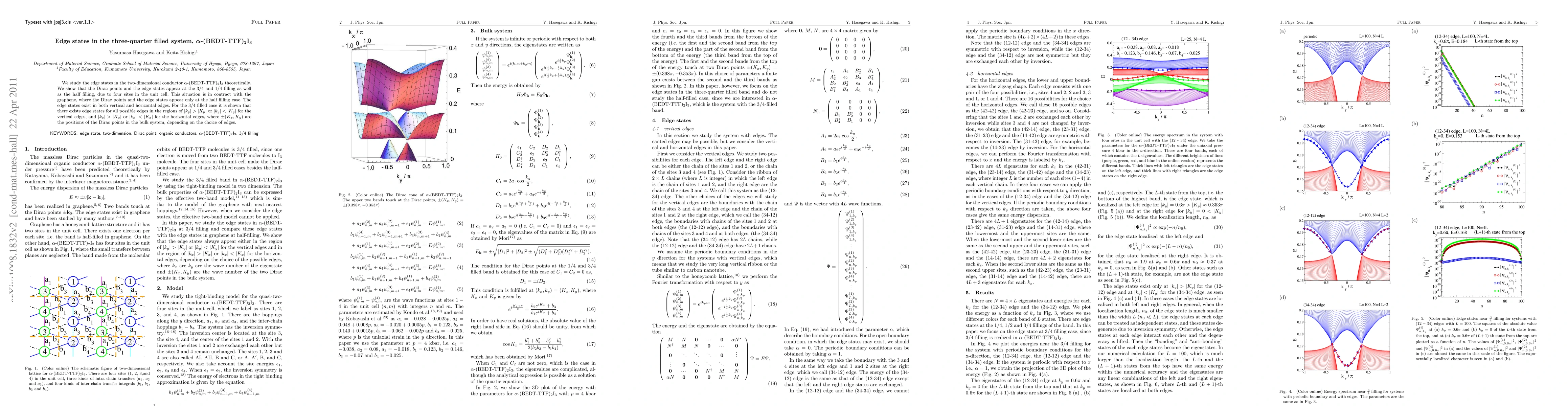 We study the edge states in the two-dimensional conductor $\alpha$-(BEDT-TTF)$_2$I$_3$ theoretically. We show that the Dirac points and the edge states appear at the 3/4 and 1/4 filling as well as the half filling, due to four sites in the unit cell. This situation is in contract with the graphene, where the Dirac points and the edge states appear only at the half filling case. It is shown that the localization length of the edge states can become very large.