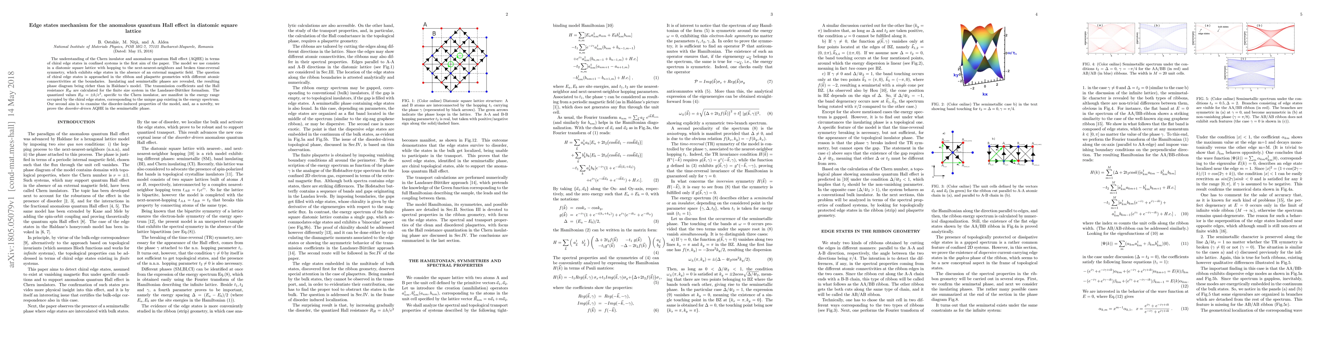 This paper explores the anomalous quantum Hall effect (AQHE) in a diatomic square lattice model with next-nearest-neighbor hopping and broken time-reversal symmetry, revealing chiral edge states without an external magnetic field. It demonstrates quantized Hall resistance in ribbon and plaquette geometries, and introduces a disorder-driven AQHE in the semi-metallic phase.