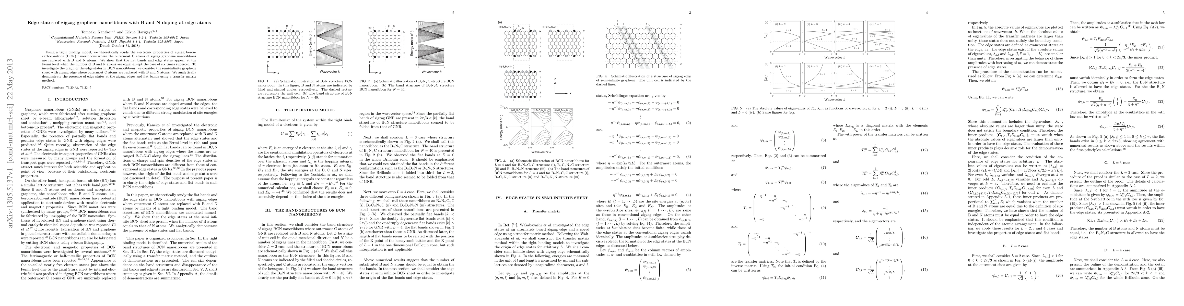 Using a tight binding model, we theoretically study the electronic properties of zigzag boron-carbon-nitride (BCN) nanoribbons where the outermost C atoms of zigzag graphene nanoribbons are replaced with B and N atoms. We show that the flat bands and edge states appear at the Fermi level when the number of B and N atoms are equal except the case of six times supercell. To investigate the origin of the edge states in BCN nanoribbons, we consider the semi-infinite graphene sheet with zigzag edge where outermost C atoms are replaced with B and N atoms. We analytically demonstrate the presence of edge states at the zigzag edges and flat bands using a transfer matrix method.