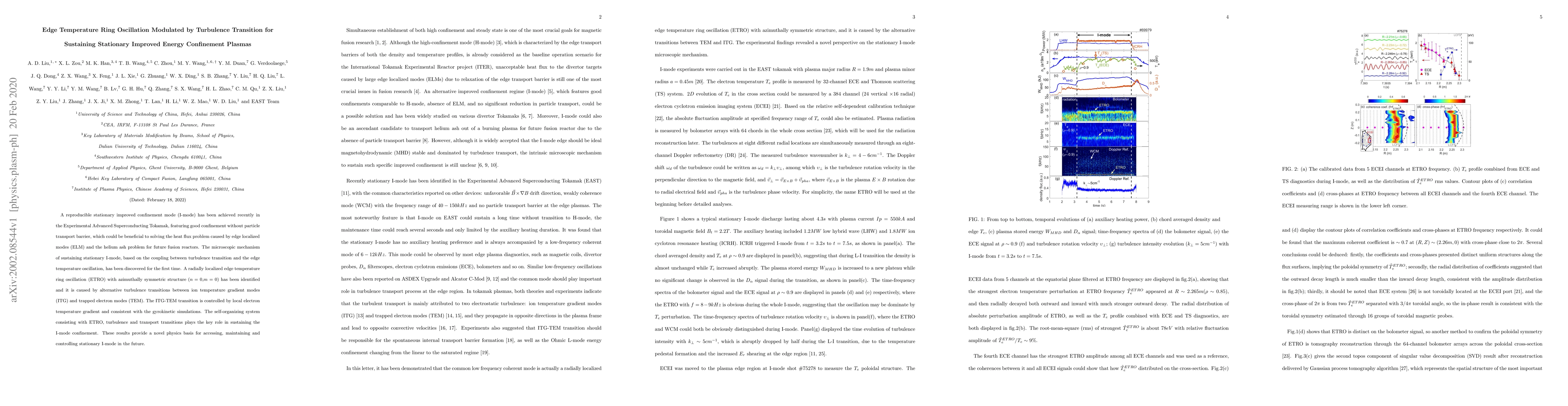 This paper identifies a radially localized edge temperature ring oscillation (ETRO) as a key mechanism for sustaining a stationary improved confinement mode (I-mode) in fusion plasmas, driven by turbulence transitions between ion temperature gradient modes and trapped electron modes. The findings offer a new physics basis for controlling I-mode confinement in future fusion reactors.